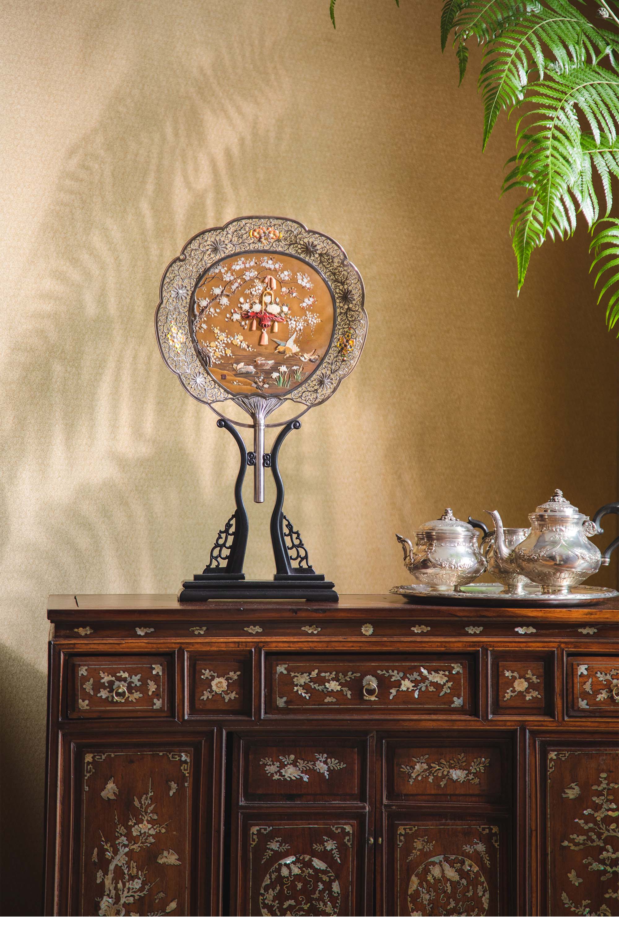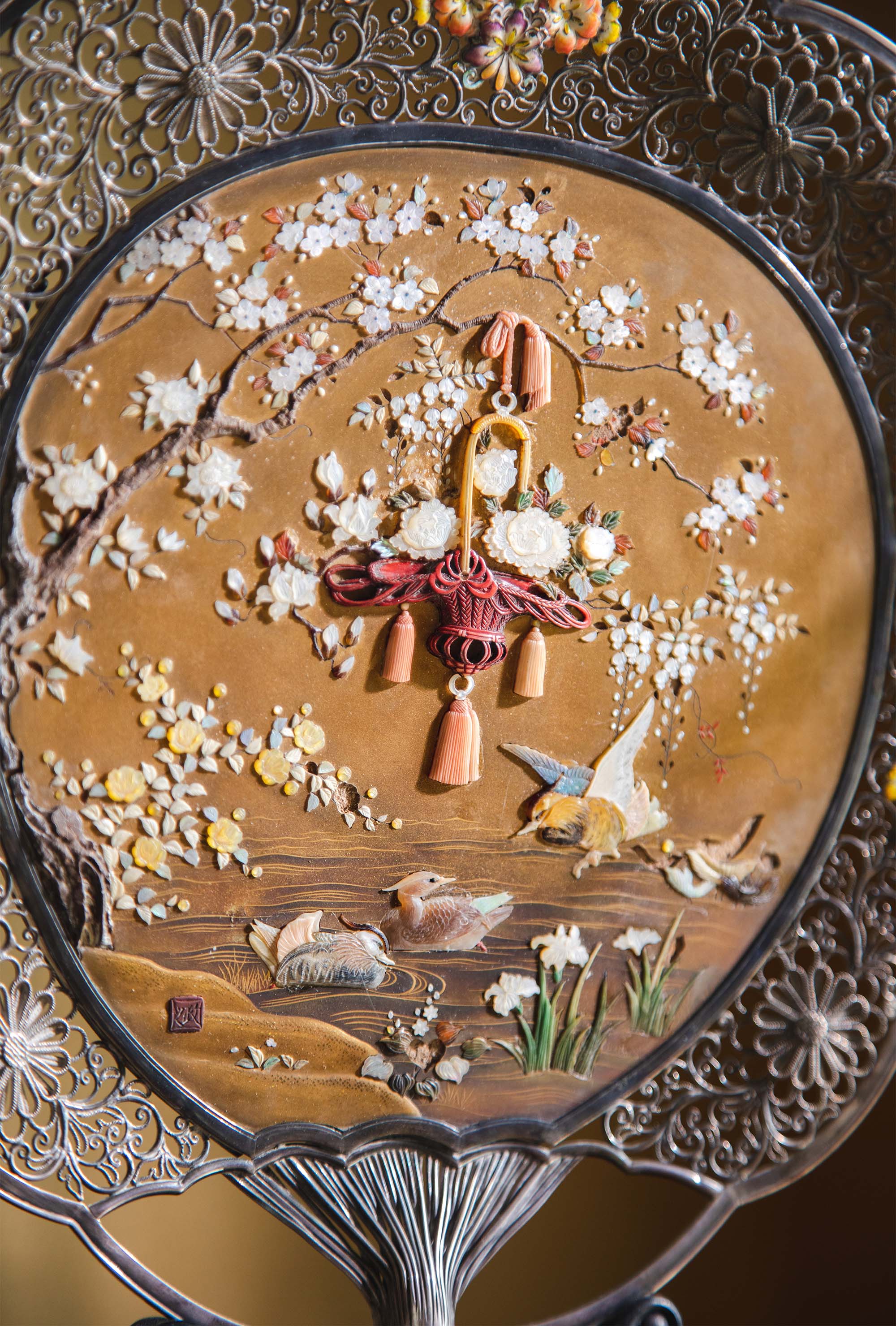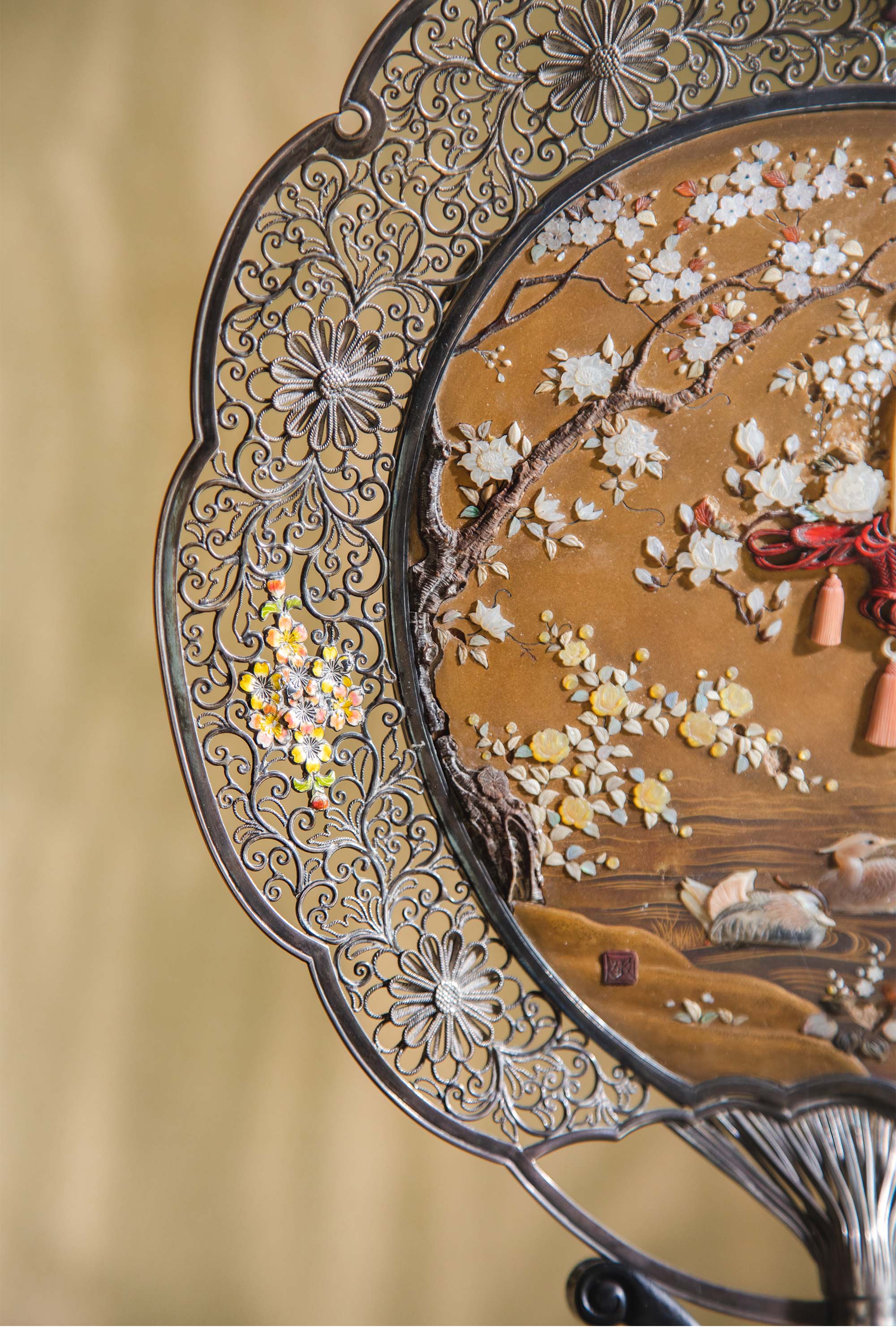 19世纪日本出品「政之」款花篮鸳鸯主题金漆地芝山镶嵌银累丝团扇造型装饰摆件