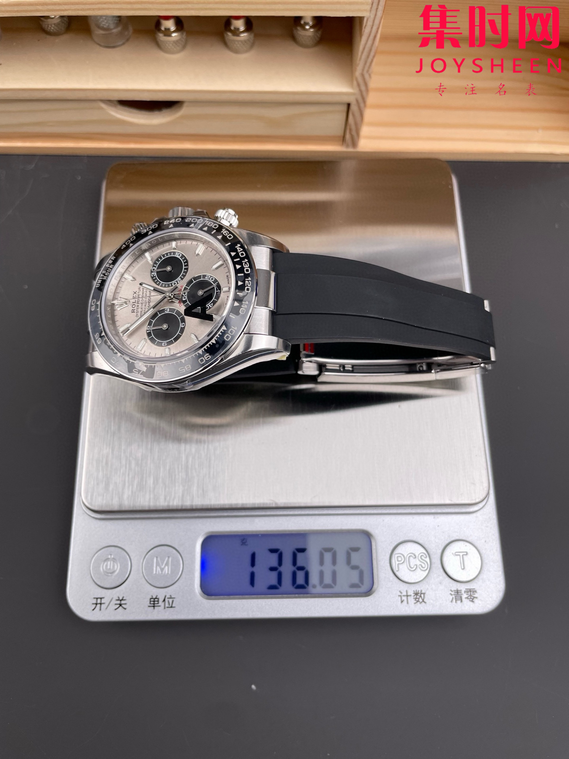 VS迪通拿胶带款配重135克+ 真正意义上的配重版本,壳没加厚的颠覆性的配重版本,真正把表壳重量配重到同步正品。而不是市场配重版本,表头重量不够,在胶带里加一整铁块的做法。VS追求的不单单是重量接近,还要手表佩戴出正品的质感,质量稳定可靠。值得信赖的版本。
