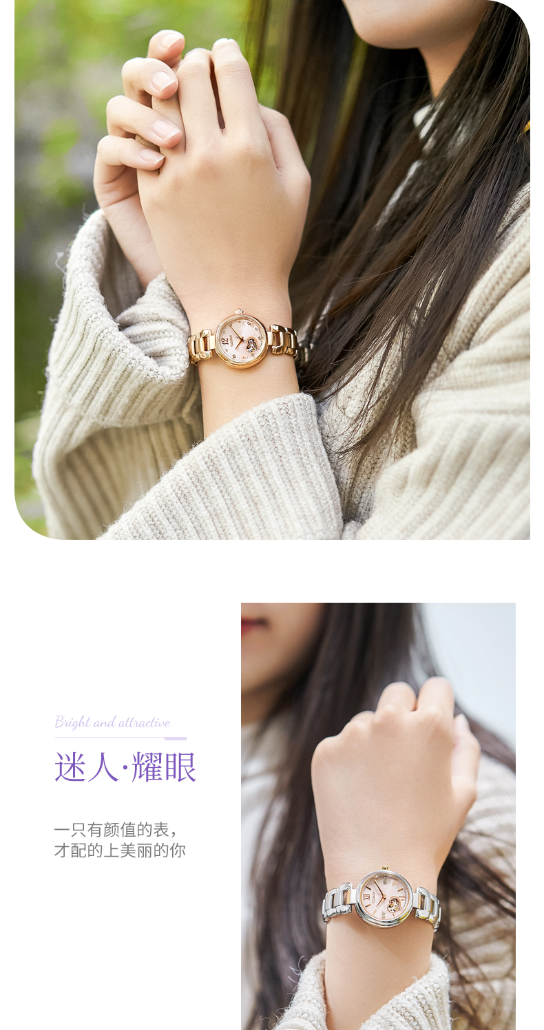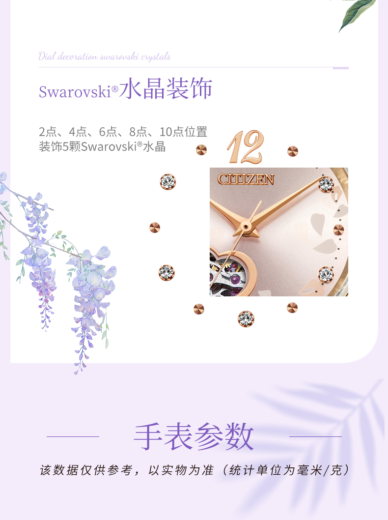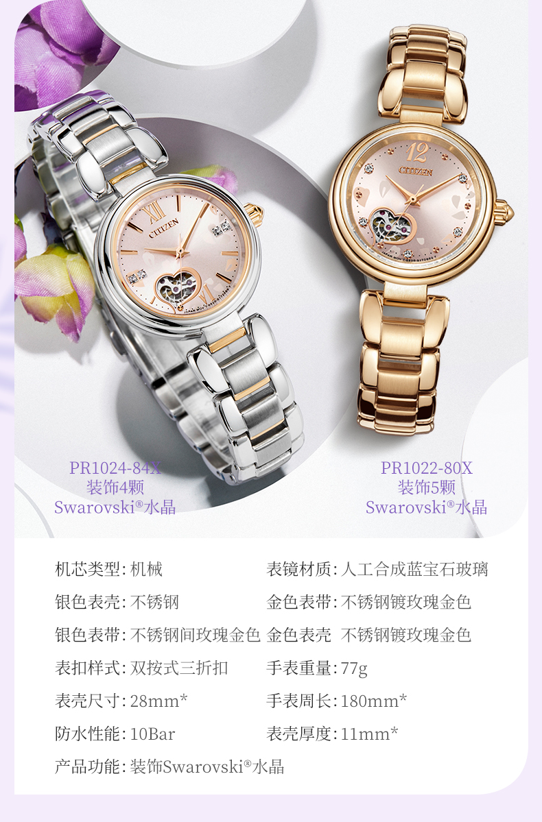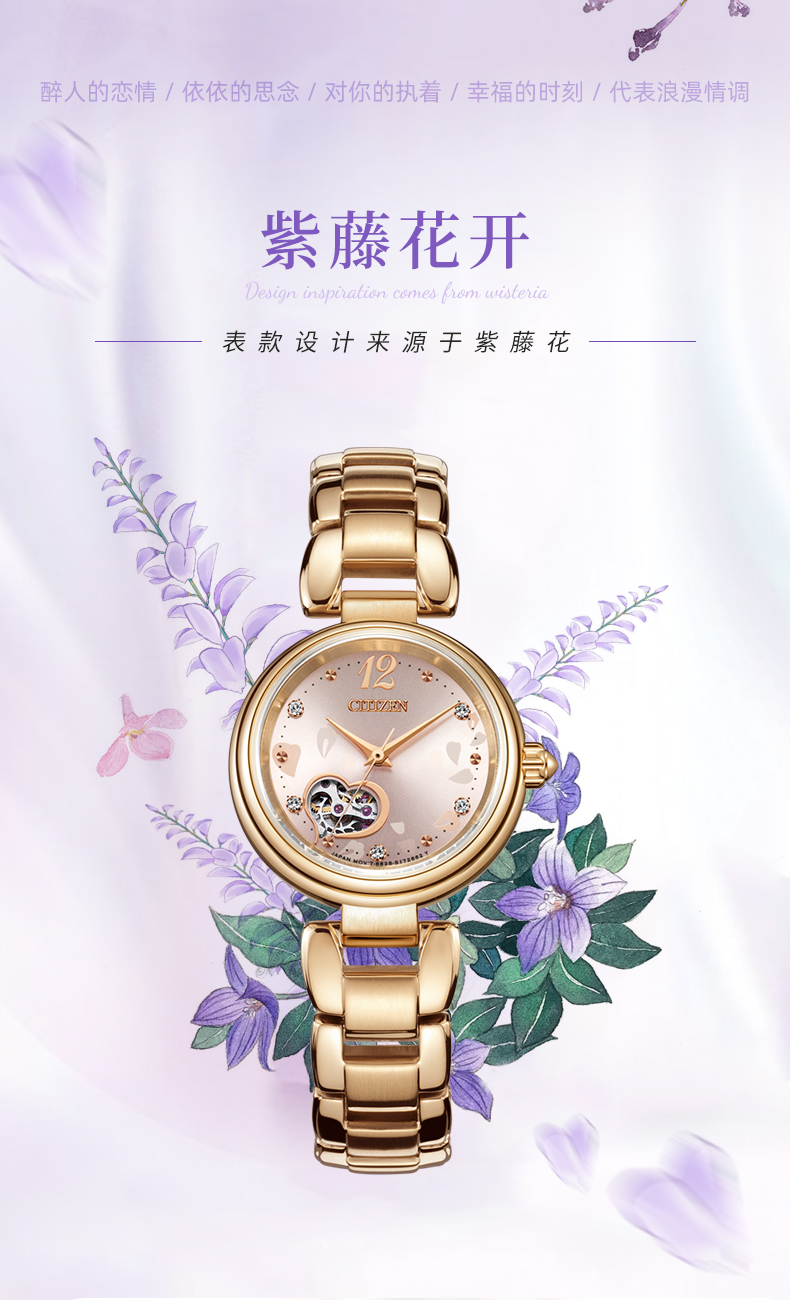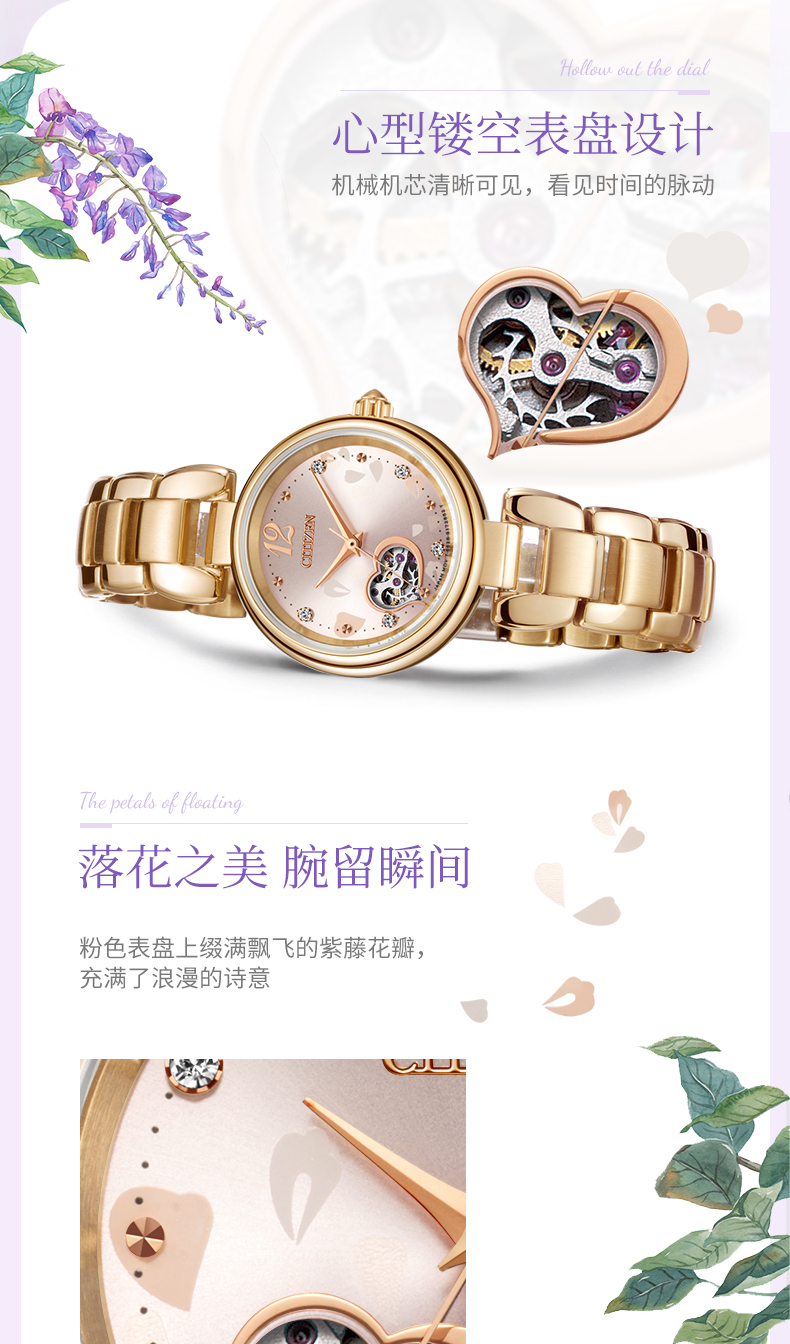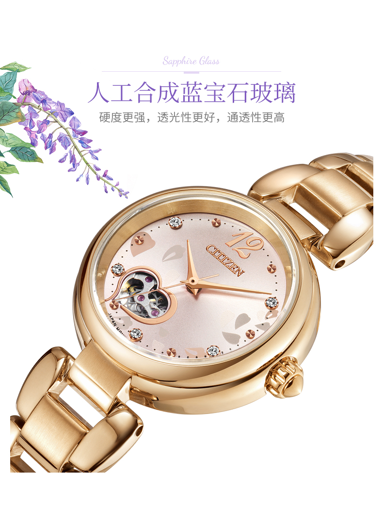 西铁城日本官方正品玫瑰金色紫藤花开镂空机械女士手表PR1022-80X