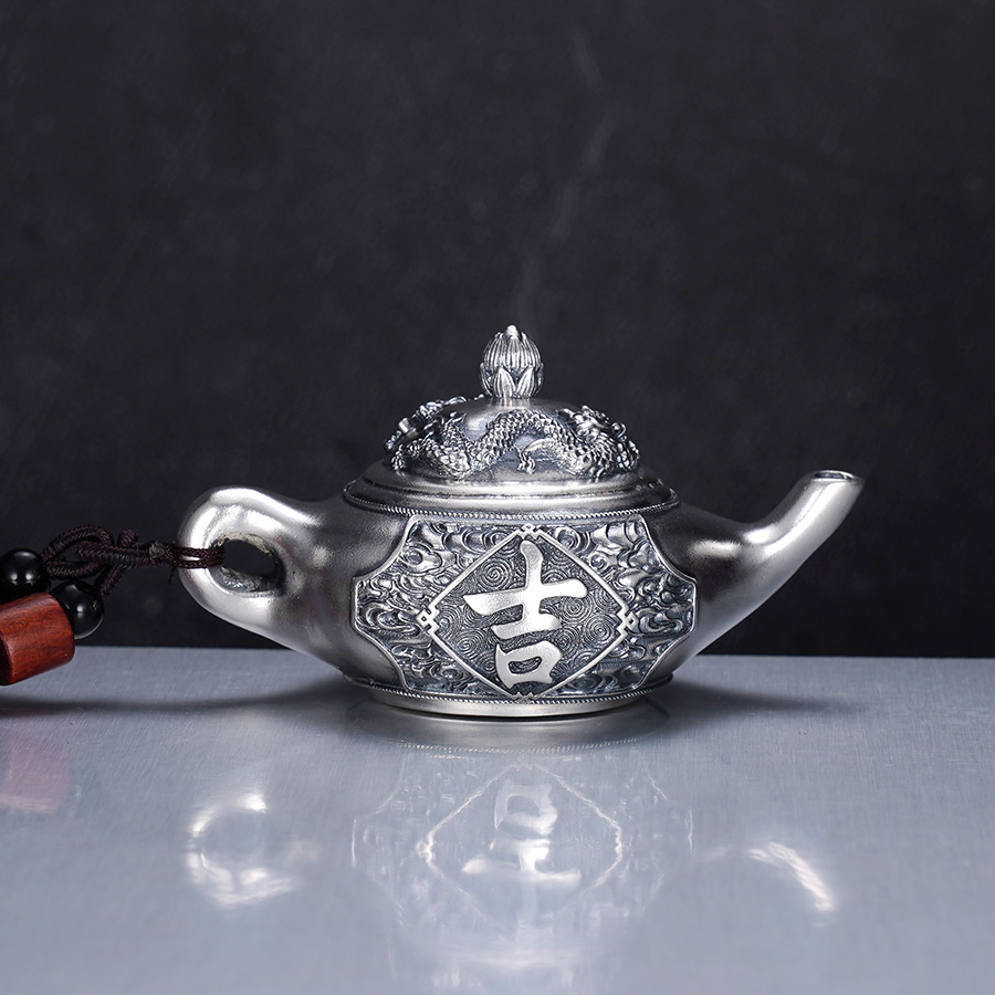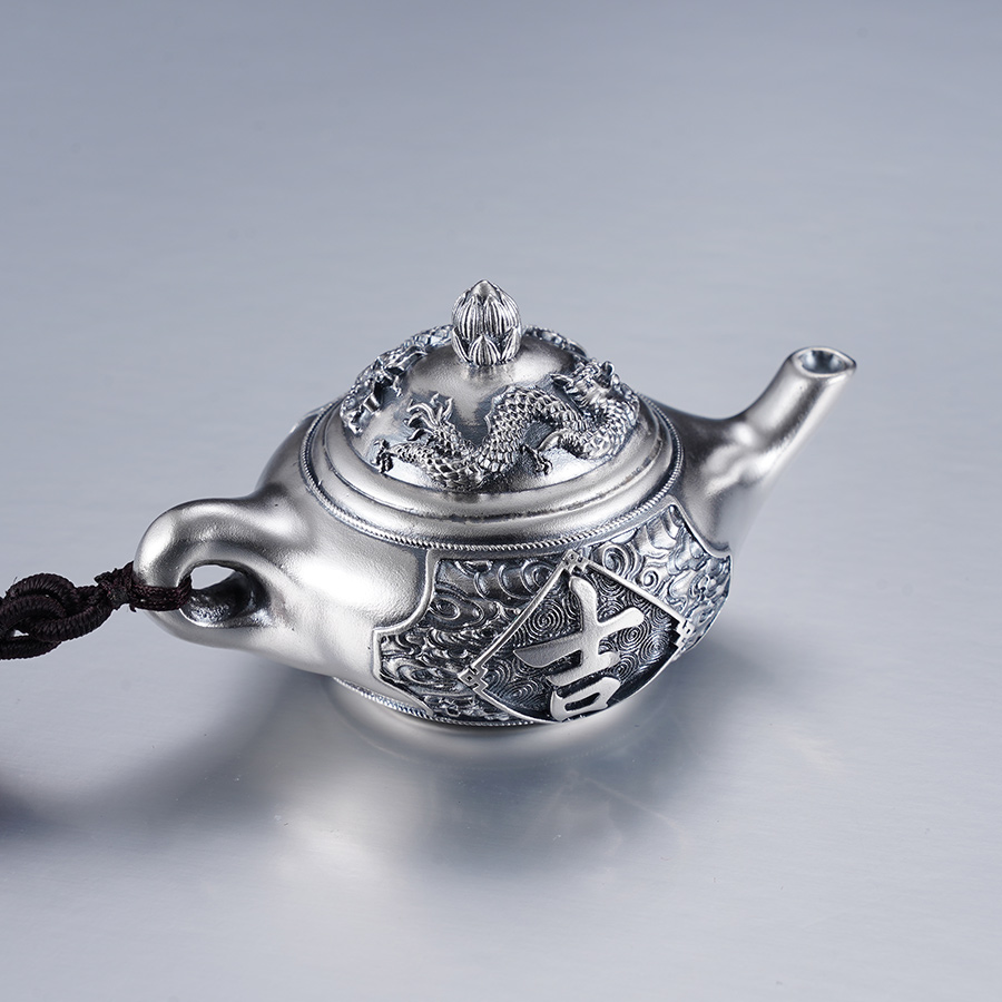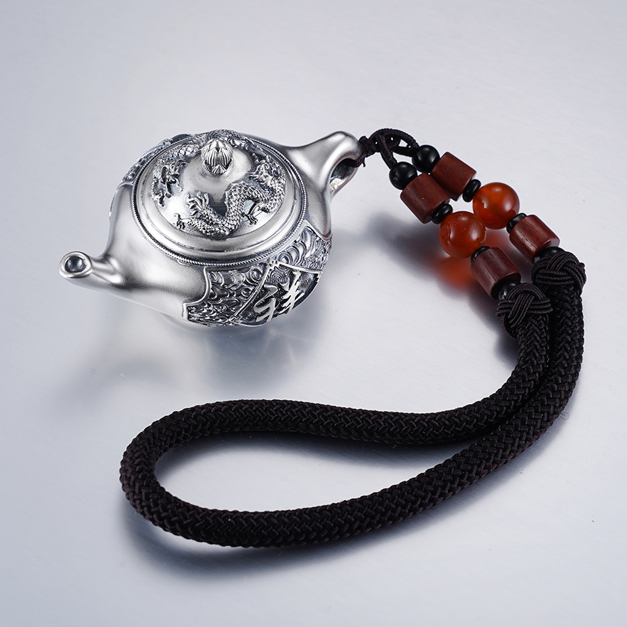 【寓意】:风云起龙骧,壮志展四方。壶形手把件之上,浮雕双龙腾云之景,寓意持有此款作品之人,遇壶得福,乘时而起,气势非凡。