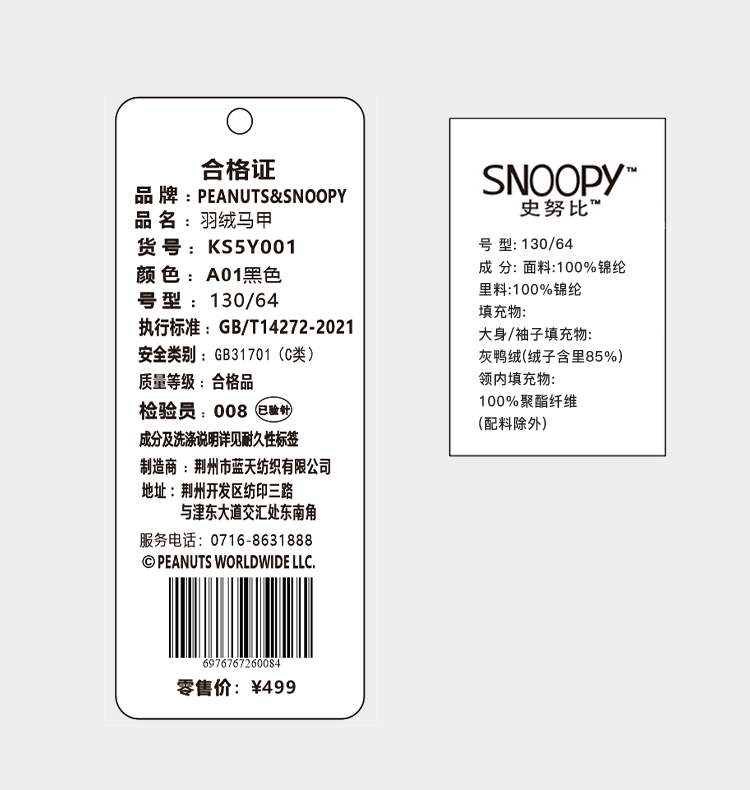 【90-160】【史努比】男女童冬款保暖羽绒马甲