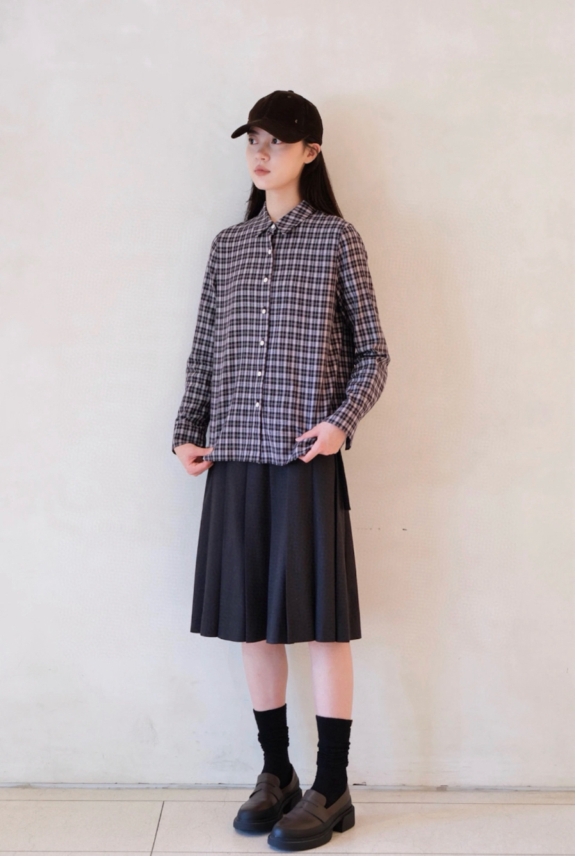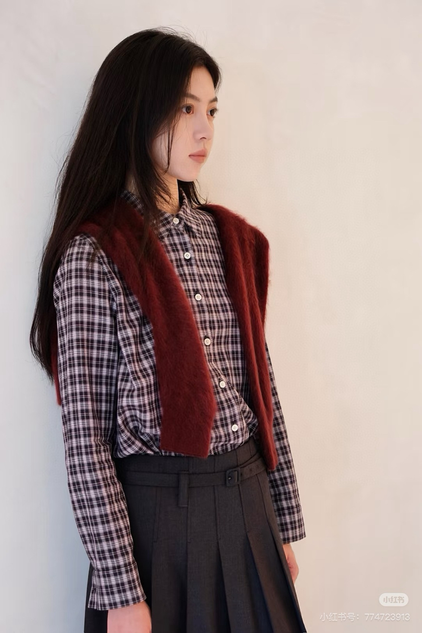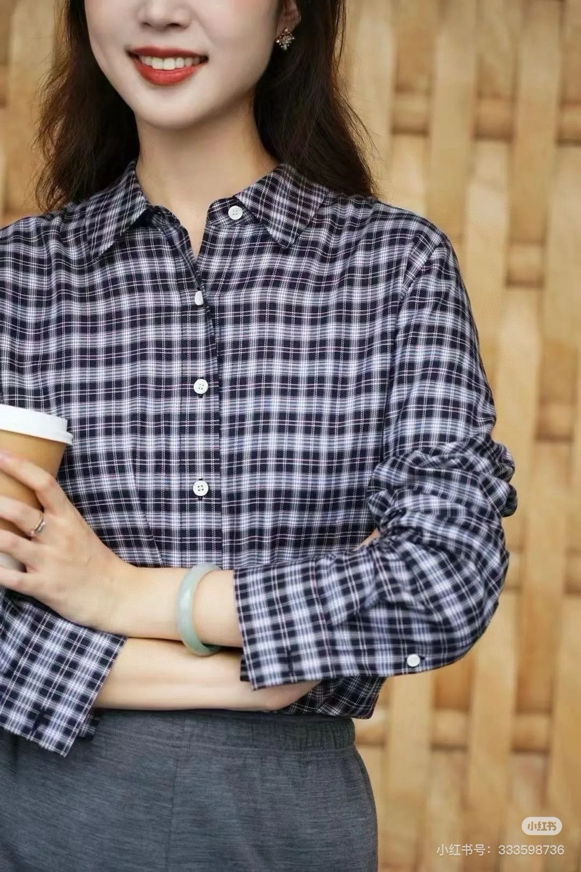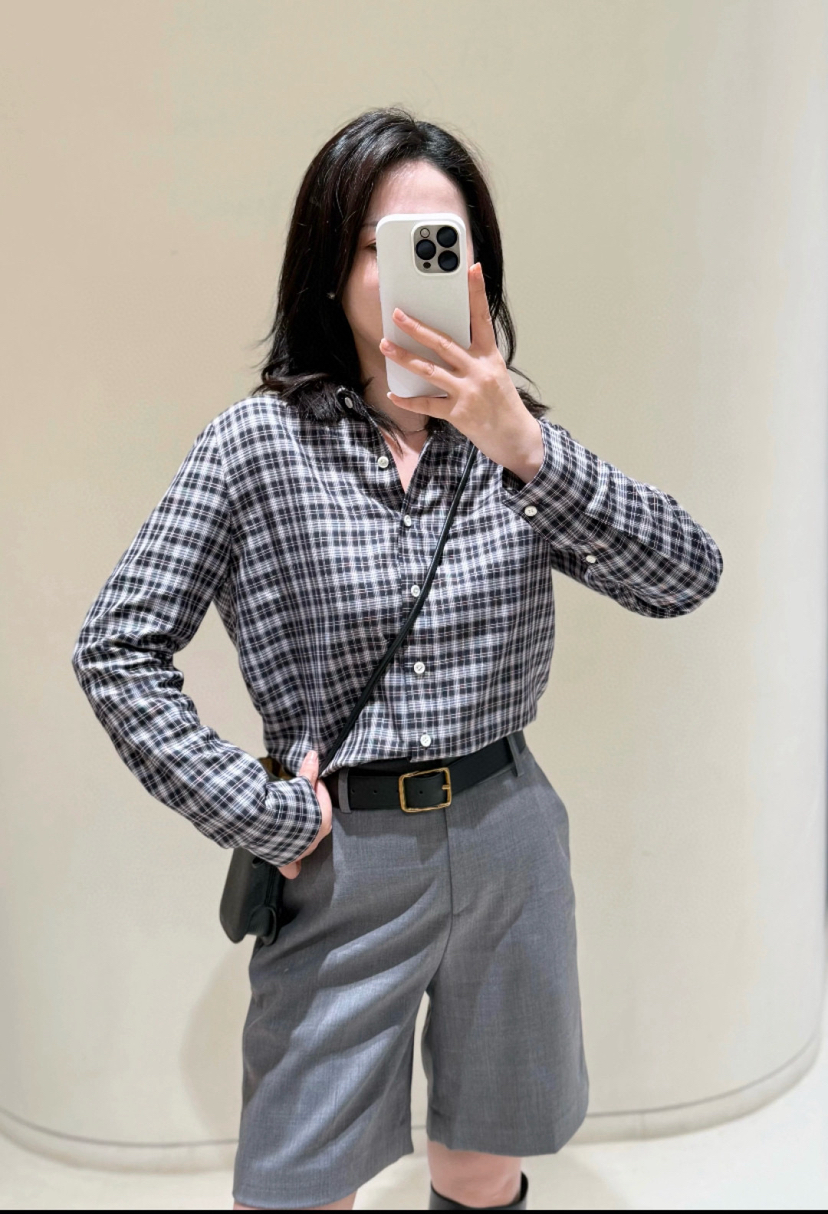 小禾这件格纹衬衫全部对齐的哈,你们看门襟处细节,色织全棉格纹面料,质地很细腻,摸着就感觉很有品质感。经典合身版型,胖瘦好穿,小翻领通勤大方。白色纽扣更显精致