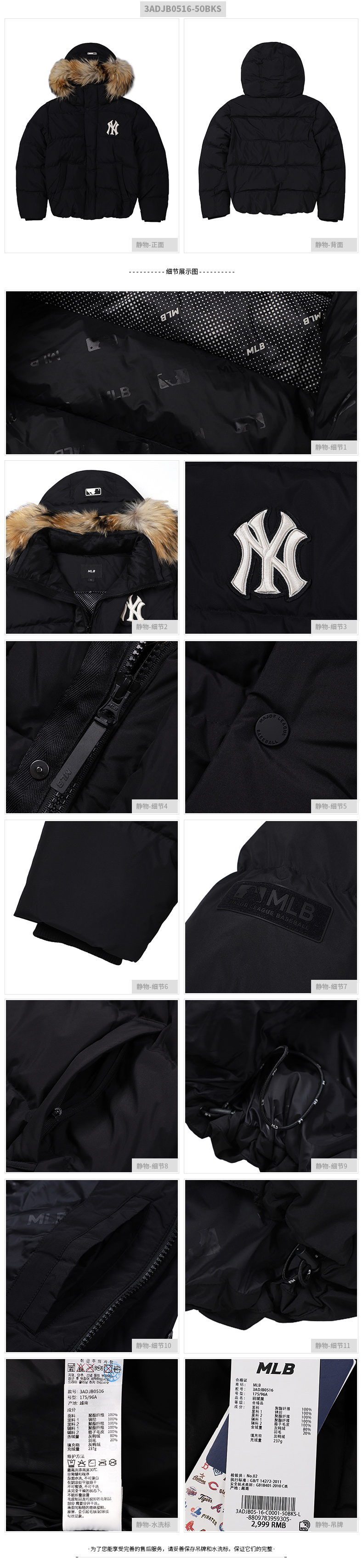 MLB官方 男女羽绒服情侣同款运动时尚潮流连帽保暖外套21年秋冬新款3ADJB0516-50BKS