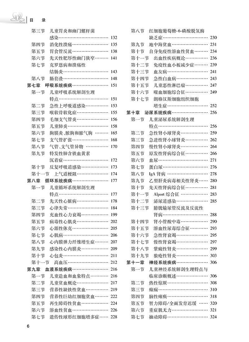 第一章 绪论 第一节 儿科学基础和临床特点 第二节 儿童年龄分期与临床特点 第五节 婴儿喂养 第九节 儿童药物治疗 第三章 症状与体征 第一节 发热 第二节 咯血 第三节 咳嗽 第四节 呼吸困难 第五节 青紫 第六节 胸痛 第七节 呕吐 第八节 便血 第九节 腹痛 第十节 肝脾大 第十一节 淋巴结肿大 第十二节 惊厥 第十三节 晕厥 第十四节 儿童肥胖 第十五节 婴儿哭吵 第四章 新生儿与新生儿疾病 第一节 新生儿的特点 第二节 新生儿窒息与复苏 第三节 新生儿黄疸 第四节 新生儿D-E血型不合溶血病 第五节 新生儿缺氧缺血性脑病与颅内出血 第六节 新生儿呼吸系统疾病 第七节 新生儿坏死性小肠结肠炎 第八节 新生儿低血糖症和高血糖症 第九节 新生儿寒冷损伤综合征 第十节 新生儿持续性肺动脉高压 第十一节 早产儿视网膜病 第十二节 新生儿感染性疾病 第十三节 新生儿宫内感染 第十四节 危重新生儿的监护与转运 第五章 营养性疾病 第一节 蛋白质2能量营养不良 第二节 营养性佝偻病 第三节 维生素F缺乏性手足搐搦症 第四节 维生素 第五节 儿童肥胖病 第六节 维生素 第七节 维生素 第八节 晚发性维生素G缺乏性出血症 第九节 微量元素缺乏 第六章 消化系统疾病 第一节 儿童消化系统解剖生理特点 第二节 儿童腹泻病 第三节 儿童胃炎和幽门螺杆菌感染 第四节 消化性溃疡 第五节 胃食管反流 第六节 先天性肥厚性幽门狭窄 第七节 克罗恩病和溃疡性结肠炎 第八节 肠套叠 第七章 呼吸系统疾病 第一节 儿童呼吸系统解剖生理特点 第二节 急性上呼吸道感染 第三节 喉软骨软化症 第四节 毛细支气管炎 第五节 儿童肺炎 第六节 胸膜炎(脓胸和脓气胸 第七节 支气管扩张 第八节 气管(支气管异物 第九节 特发性肺含铁血黄素沉着症 第十节 反复呼吸道感染 第十一节 上气道梗阻 第八章 循环系统疾病 第一节 儿童循环系统解剖生理特点 第二节 先天性心脏病 第三节 心律失常 第四节 充血性心力衰竭 第五节 病毒性心肌炎 第六节 心源性休克 第八节 心内膜弹力纤维增生症 第十节 心包炎 第九章 血液系统疾病 第一节 儿童造血和血象特点 第二节 儿童贫血概论 第四节 营养性巨幼红细胞贫血 第九节 地中海贫血 第十一节 出血性疾病概论 第十三节 血友病 第十五节 儿童恶性淋巴瘤 第十七节 朗格汉斯细胞组织细胞增生症 第十章 泌尿系统疾病 第一节 儿童泌尿系统解剖生理特点 第二节 急性肾小球肾炎 第四节 慢性肾小球肾炎 第六节 血尿 第八节 #NAME? 第十节 先天性肾病综合征 第十二节 泌尿道感染 第十四节 肾小管酸中毒 第十六节 急性肾衰竭 第十八节 紫癜性肾炎 第六节 重症肌无力 第七节 抽动障碍 第八节 吉兰2巴雷综合征 第九节 急性小脑性共济失调 第十节 急性脊髓炎 第十一节 抗 第十二节 神经皮肤综合征 第十三节 儿童动脉缺血性卒中 第十四节 脑白质营养不良 第十五节 急性播散性脑脊髓炎 第十二章 心理及行为障碍 第一节 睡眠障碍 第二节 遗尿症 第三节 儿童注意缺陷多动障碍 第四节 孤独症 第五节 青春期心理行为特征与紊乱 第六节 其他 第十三章 风湿性疾病 第一节 概论 第二节 风湿热 第三节 幼年特发性关节炎 第四节 儿童系统性红斑狼疮 第五节 幼年皮肌炎 第六节 过敏性紫癜 第七节 多发性大动脉炎 第八节 结节性多动脉炎 第九节 川崎病 第十节 白塞病 第十一节 混合性结缔组织病 第十四章 内分泌系统疾病 第一节 概论 第二节 先天性甲状腺功能减退症 第三节 甲状腺功能亢进症 第四节 儿童糖尿病 第五节 身材矮小 第六节 性早熟 第七节 尿崩症 第八节 先天性肾上腺皮质增生症 第九节 甲状旁腺功能减退症 第十五章 遗传性和代谢性疾病 第一节 概论 第二节 新生儿筛查 第三节 2三体综合征 第四节 MNJOPJ综合征 第五节 糖原贮积症 第六节 黏多糖贮积症 第七节 苯丙酮尿症 第八节 戈谢病 第九节 肝豆状核变性 第十六章 儿童结核病 第一节 概论 第二节 原发型肺结核 第三节 急性粟粒性肺结核 第四节 结核性胸膜炎 第五节 腹腔结核病 第六节 结核性脑膜炎 第七节 周围淋巴结结核 第八节 结核潜伏感染 第十七章 感染性疾病 第一节 流行性感冒 第二节 出疹性疾病 第三节 流行性腮腺炎 第四节 流行性乙型脑炎 第五节 病毒性脑炎 第六节 脊髓灰质炎 第七节 病毒性肝炎 第八节 Q-病毒感染 第九节 巨细胞病毒感染 第十节 狂犬病 第十一节 R+S感染 第十二节 百日咳 第十三节 白喉 第十四节 流行性脑脊髓膜炎 第十五节 化脓性脑膜炎 第十六节 伤寒和副伤寒 第十七节 霍乱 第十八节 细菌性痢疾 第十九节 食物中毒 第二十节 败血症 第二十一节 院内感染 第二十二节 厌氧菌感染 第二十三节 淋病 第二十四节 支原体感染 第二十五节 衣原体感染 第二十六节 真菌感染 第二十七节 钩端螺旋体病 第二十八节 其他$立克次体病 第二十九节 蛔虫病 第三十节 钩虫病 第三十一节 蛲虫病 第三十二节 弓形虫病 第三十三节 疟疾 第三十四节 阿米巴病 第三十五节 血吸虫病 第十八章 免疫缺陷性疾病 $33 第一节 概述 第二节 T连锁无丙种球蛋白血症 第三节 湿疹血小板减少伴免疫缺陷综合征 第四节 6+3G" 第五节 T连锁联合免疫缺陷病 第六节 T连锁高 第七节 T连锁淋巴组织增生性疾病 第八节 慢性肉芽肿病 第九节 冷炎素相关