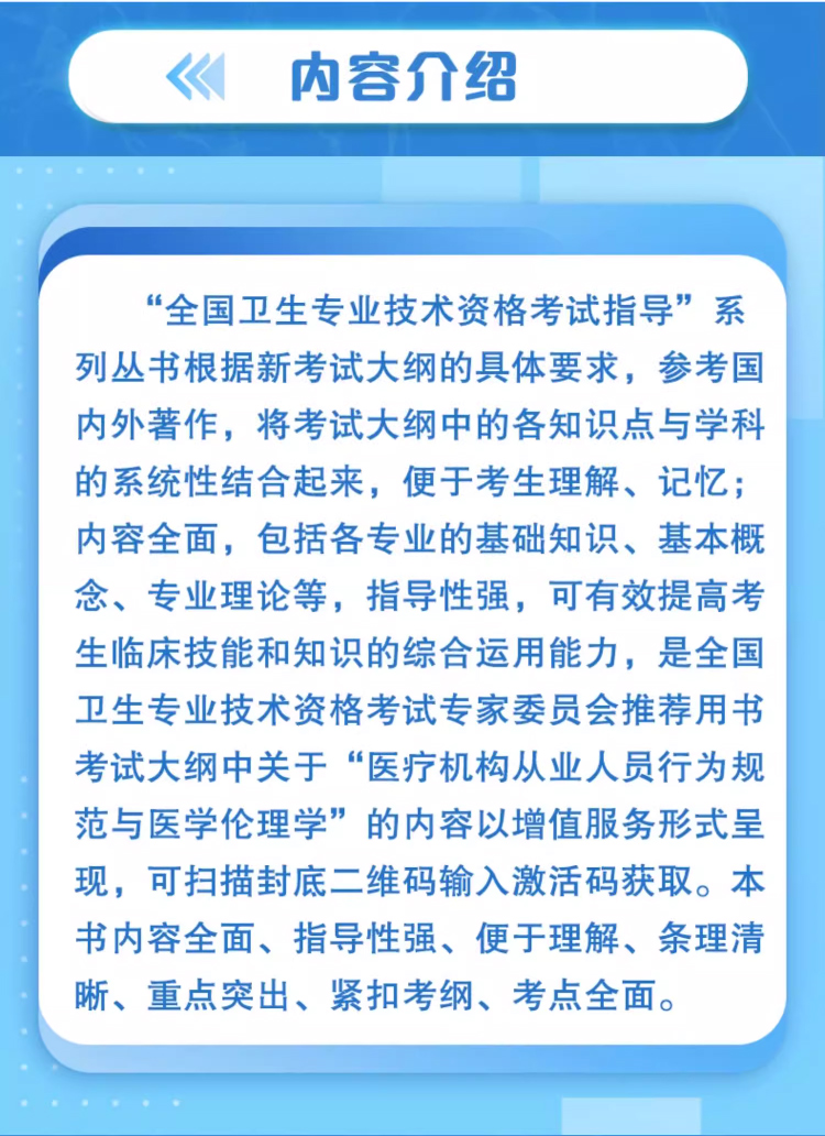 “全国卫生专业技术资格考试指导”系列丛书根据最新考试大纲的具体要求,参考国内外权威著作,将考试大纲中的各知识点与学科的系统性结合起来,便于考生理解、记忆;内容全面,包括各专业的基础知识、基本概念、专业理论等,指导性强,可有效提高考生临床技能和知识的综合运用能力,是全国卫生专业技术资格考试专家委员会推荐用书。考试大纲中关于“医疗机构从业人员行为规范与医学伦理学”的内容以增值服务形式呈现,可 扫描封底二维码输入激活码获取。