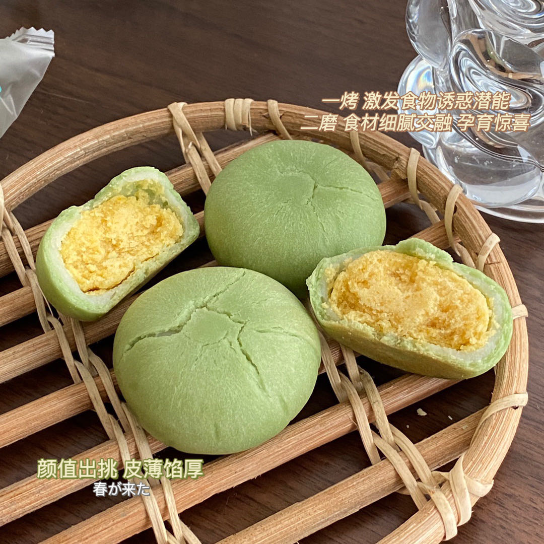 1:个头饱满,皮薄馅厚,加人雪媚娘 馅甜而适口,食而不腻,轻柔细捻,细致烘焙