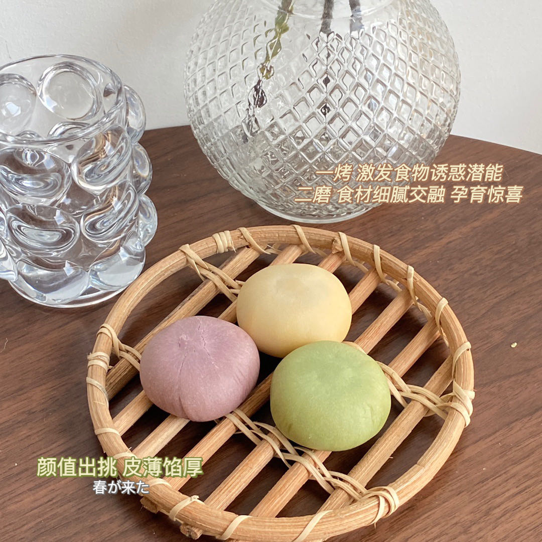 2:一烤,激发实物诱惑潜能,二磨,食材细腻交融,孕育惊喜,颜值出挑,皮薄馅厚