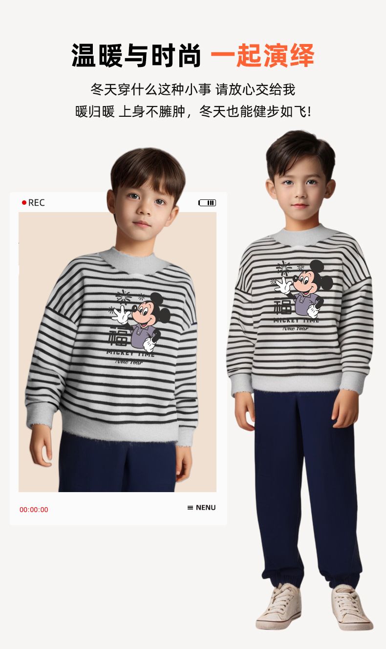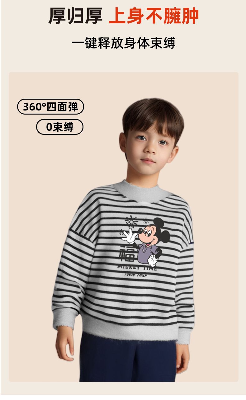 迪士尼男童加绒卫衣加厚冬季儿童打底衫半高领一体绒条纹上衣洋气
