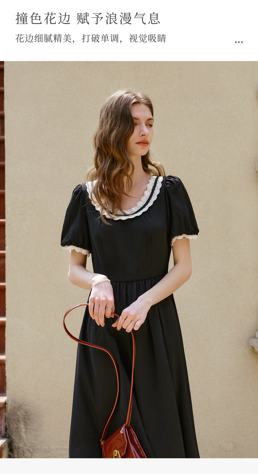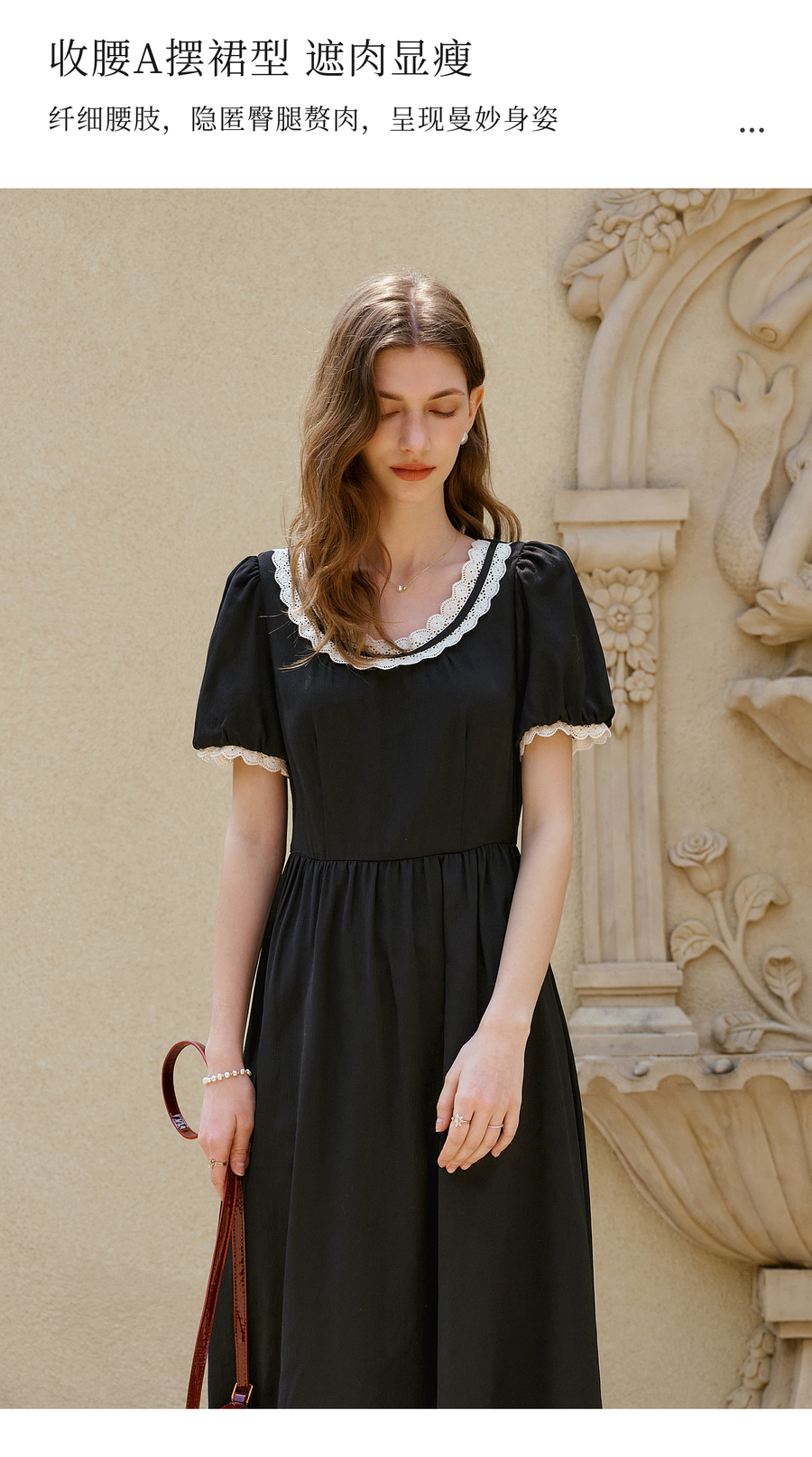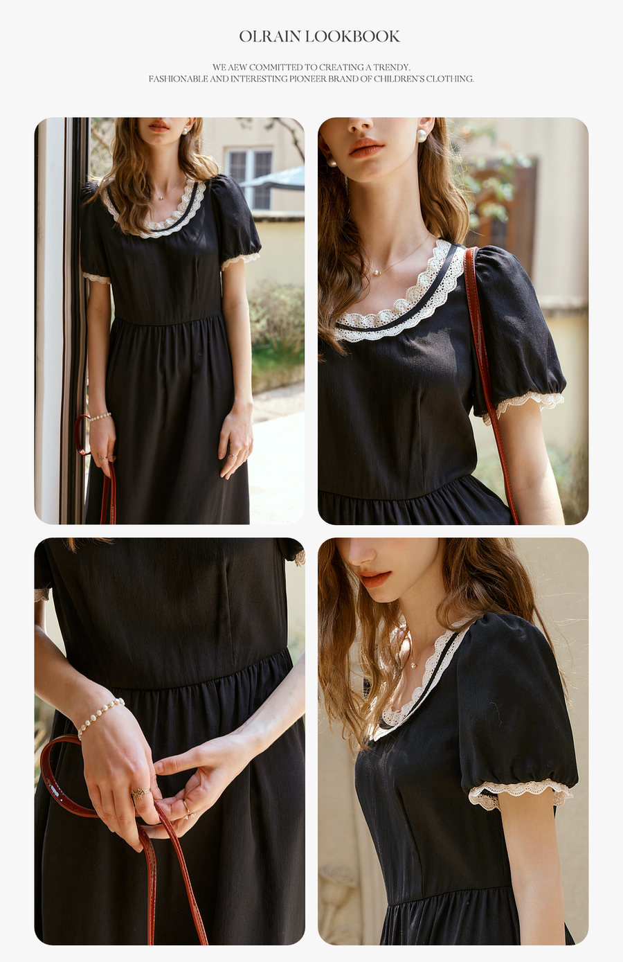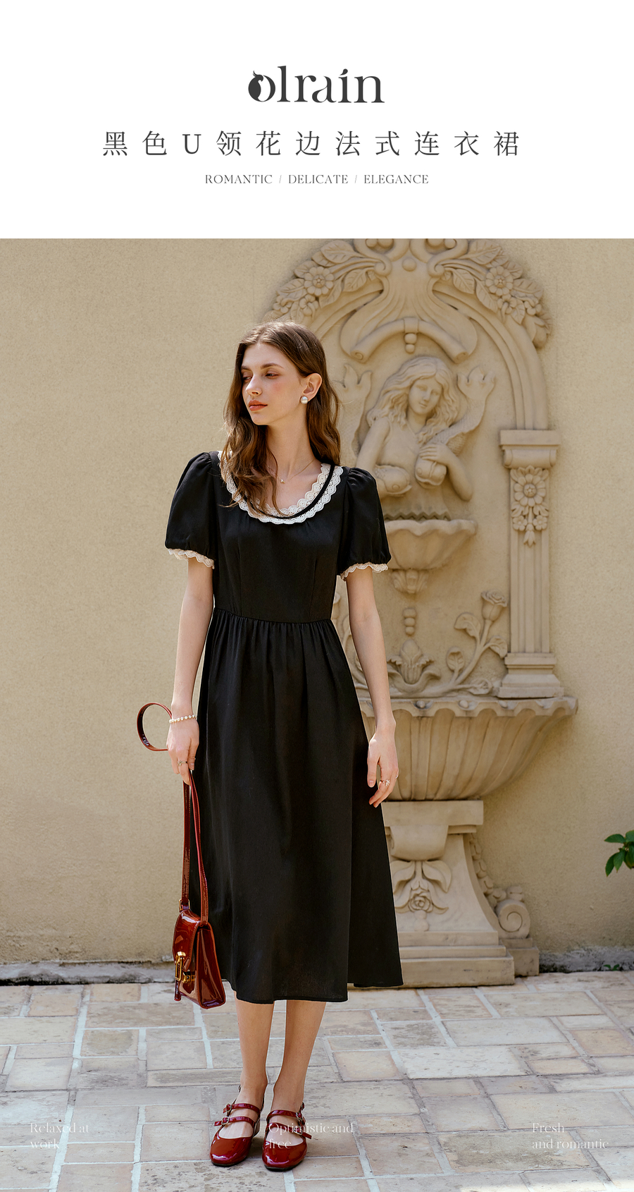 OLrain欧芮儿U领花边法式黑色可调节腰带夏季2025新款宽松连衣裙
