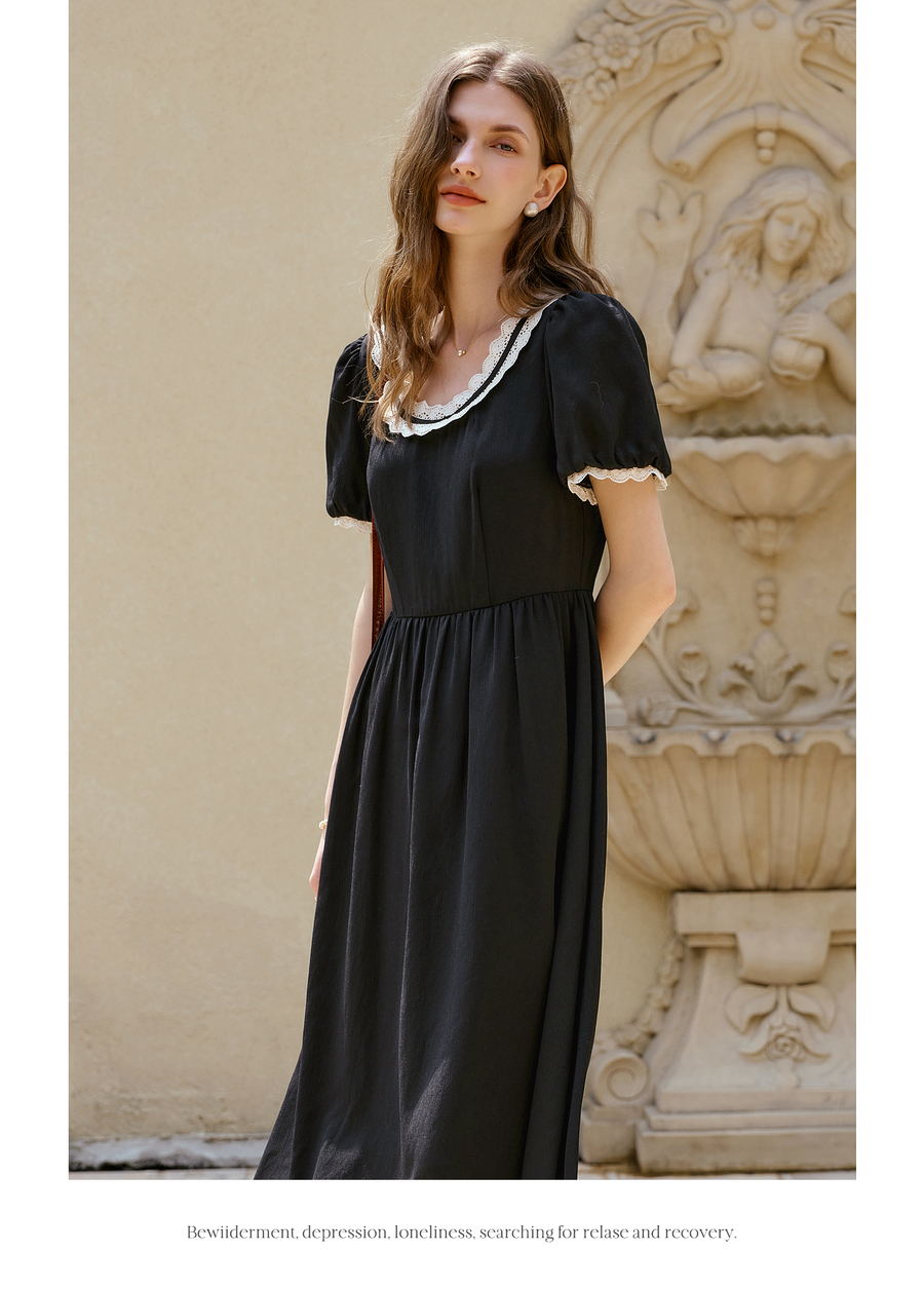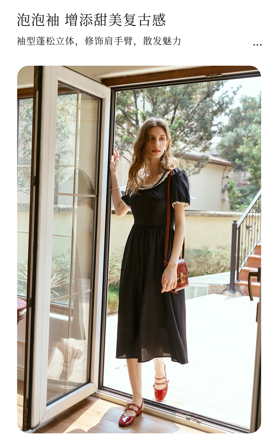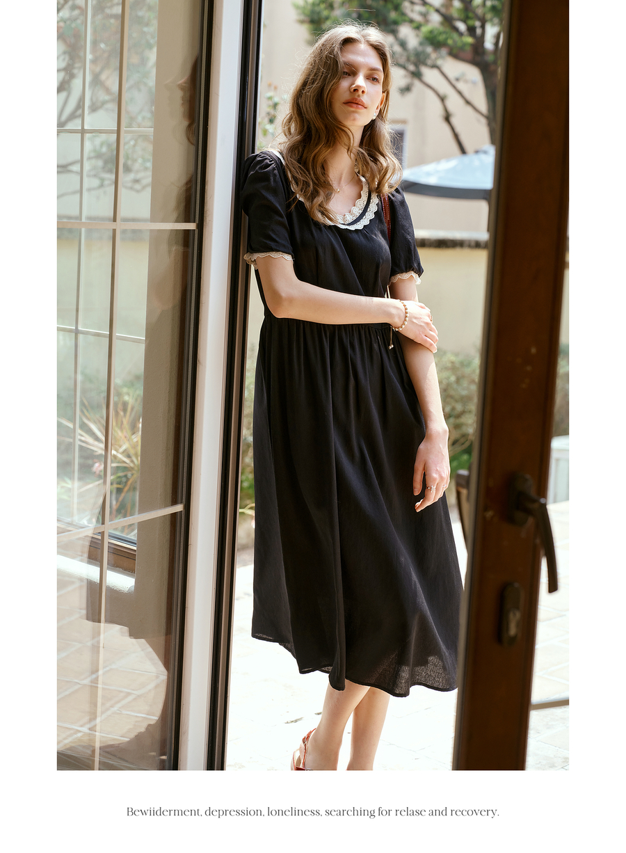 OLrain欧芮儿U领花边法式黑色可调节腰带夏季2025新款宽松连衣裙