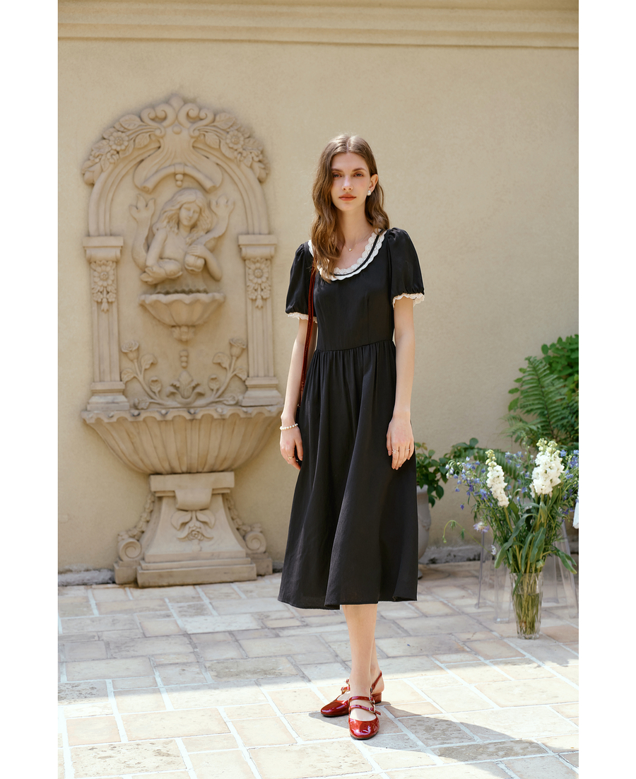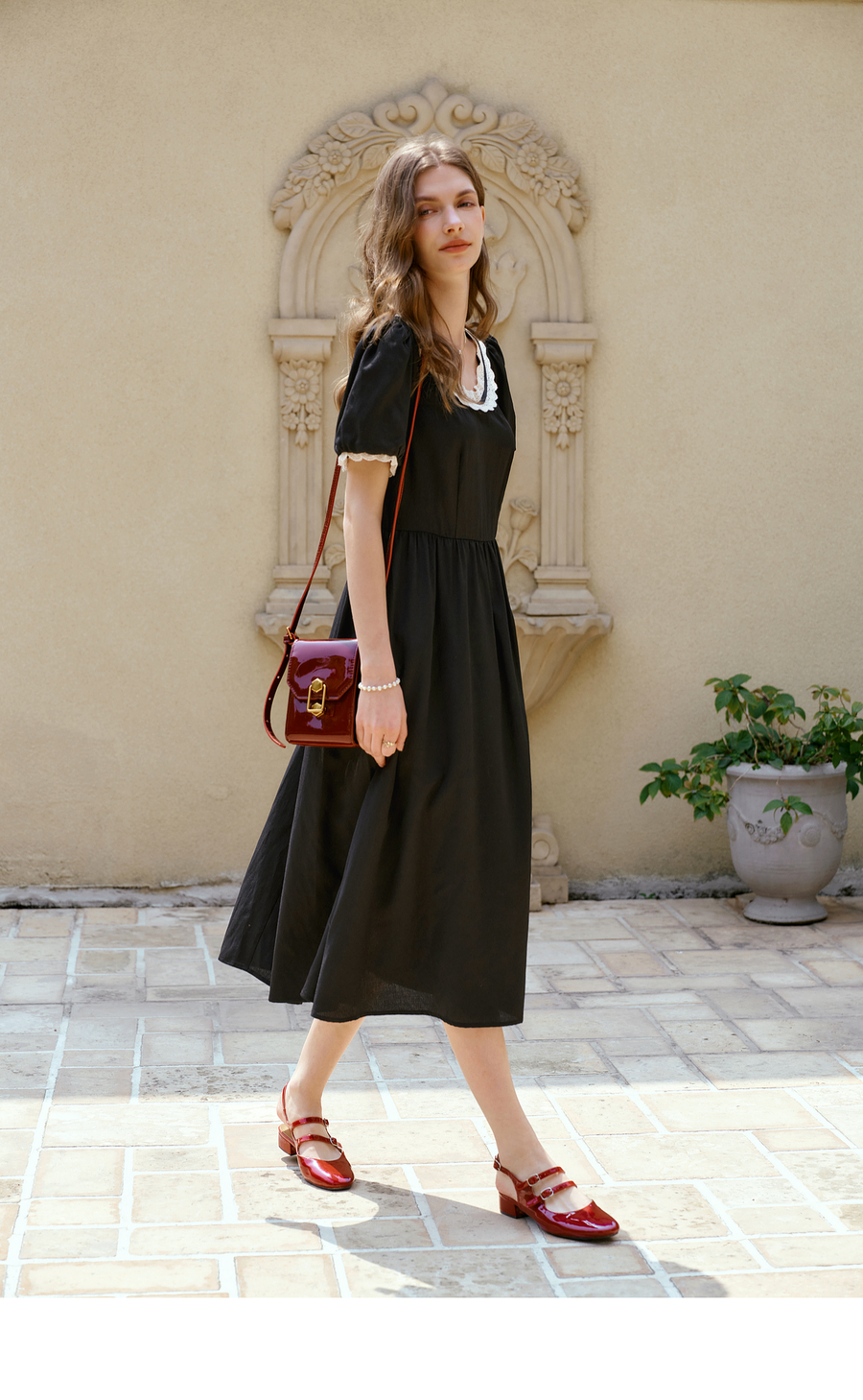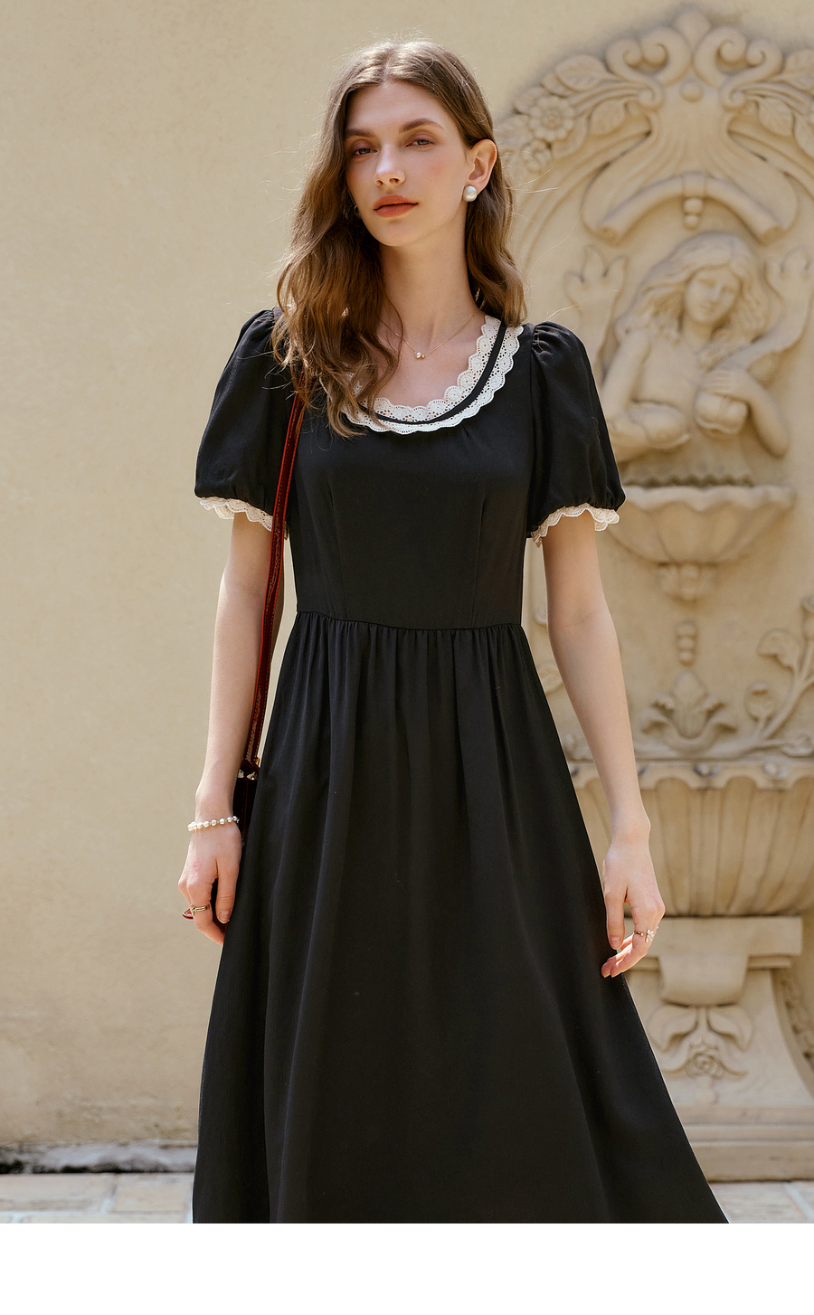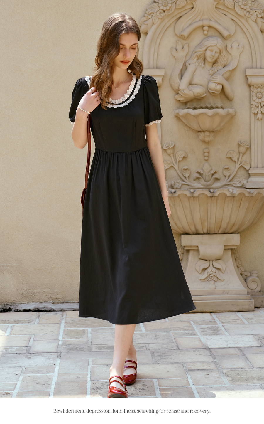 OLrain欧芮儿U领花边法式黑色可调节腰带夏季2025新款宽松连衣裙