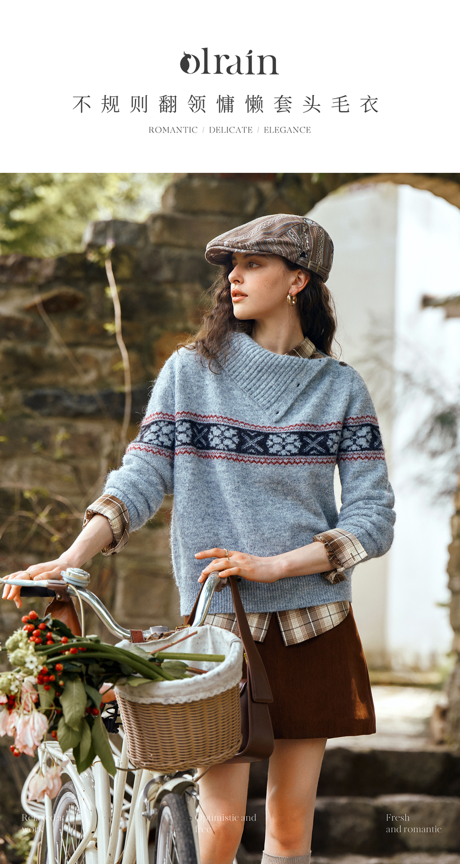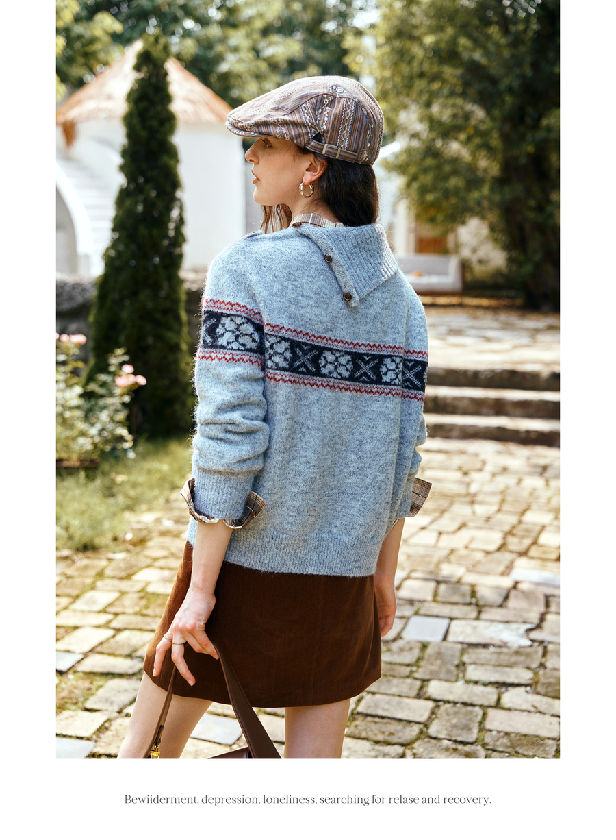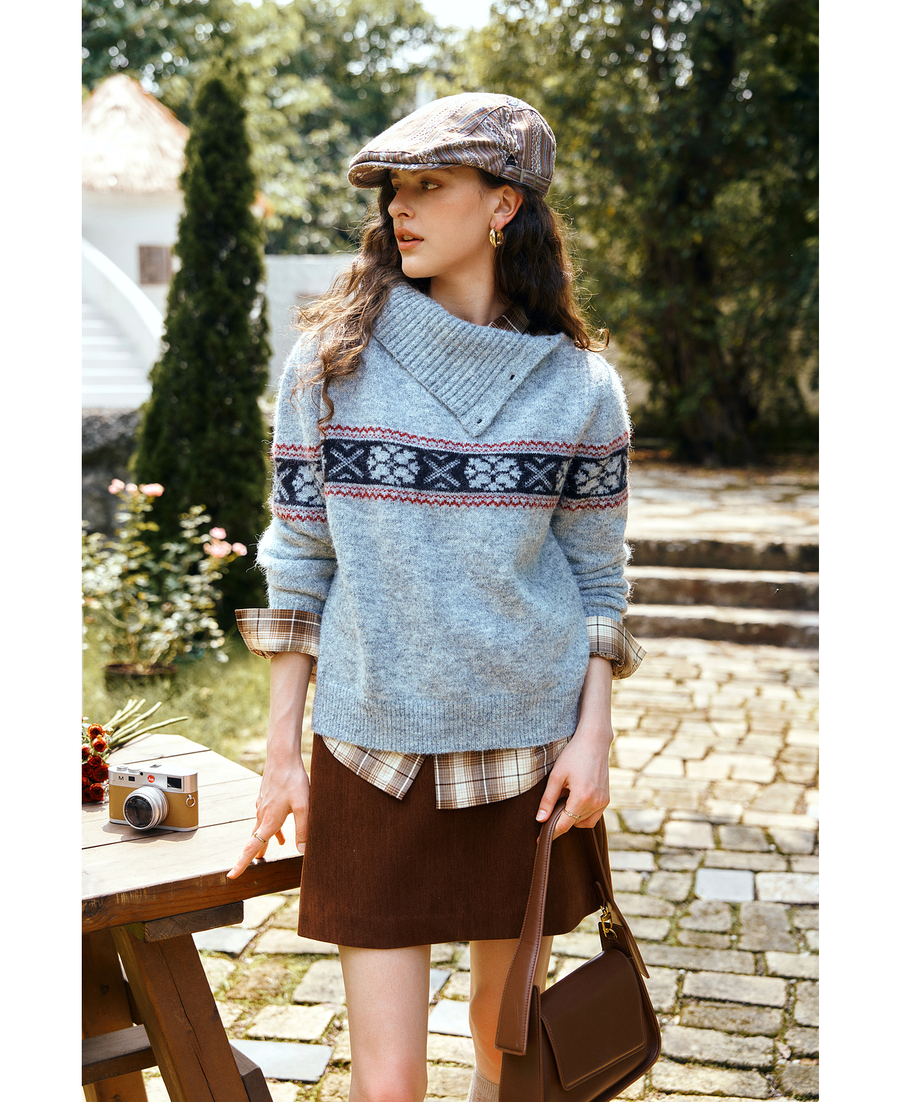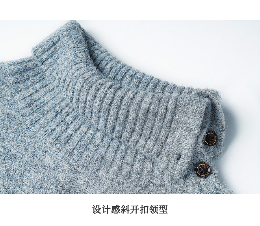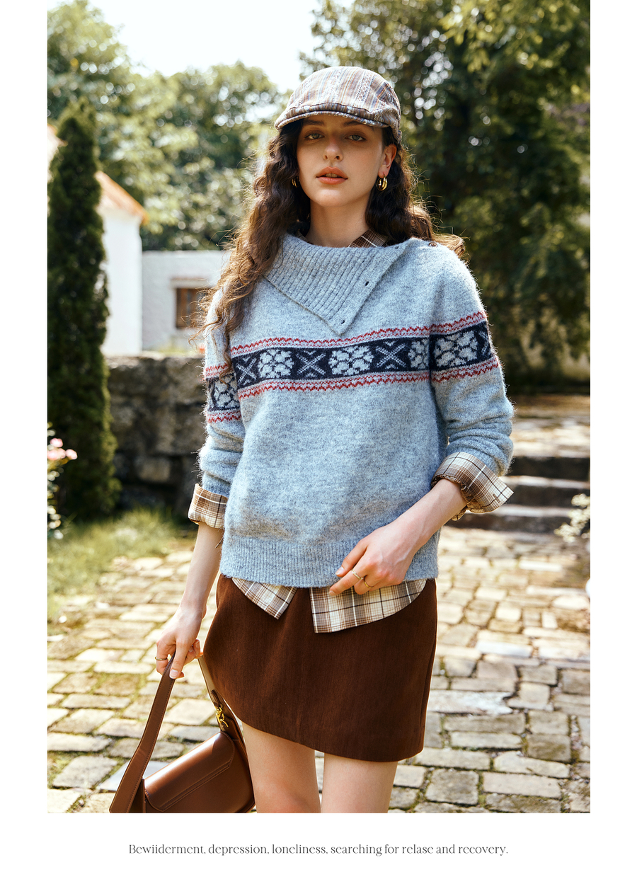 OLrain欧芮儿2025新款女秋季不规则翻领慵懒套头毛衣慵懒羊毛上衣