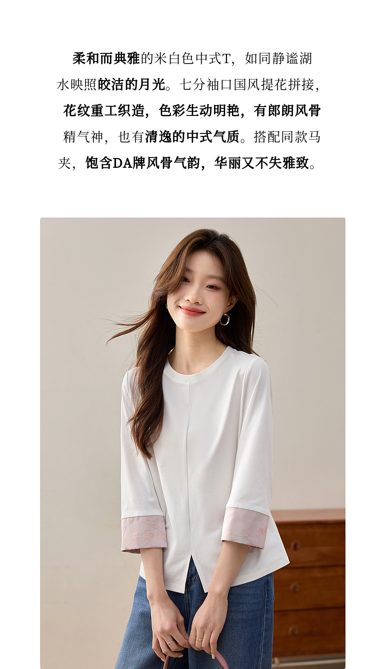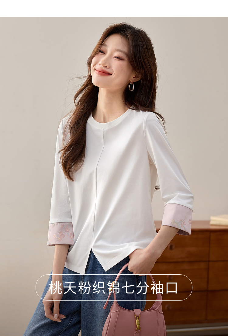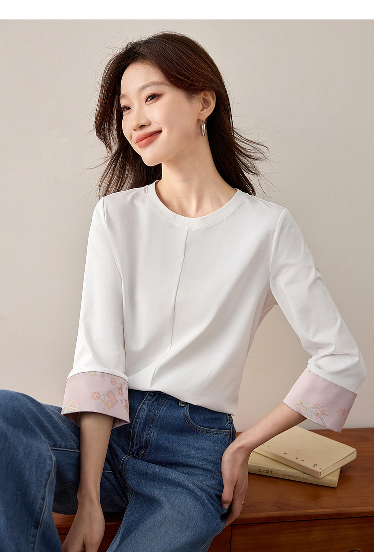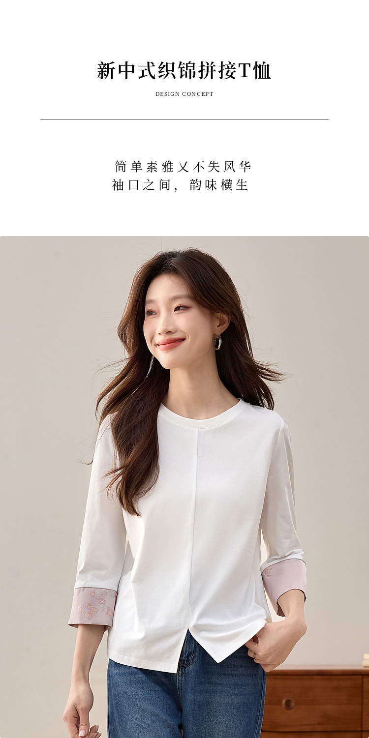 【周四狂欢价】熙世界新中式刺绣圆领T恤女秋季2025新款国风织锦休闲白色打底衫