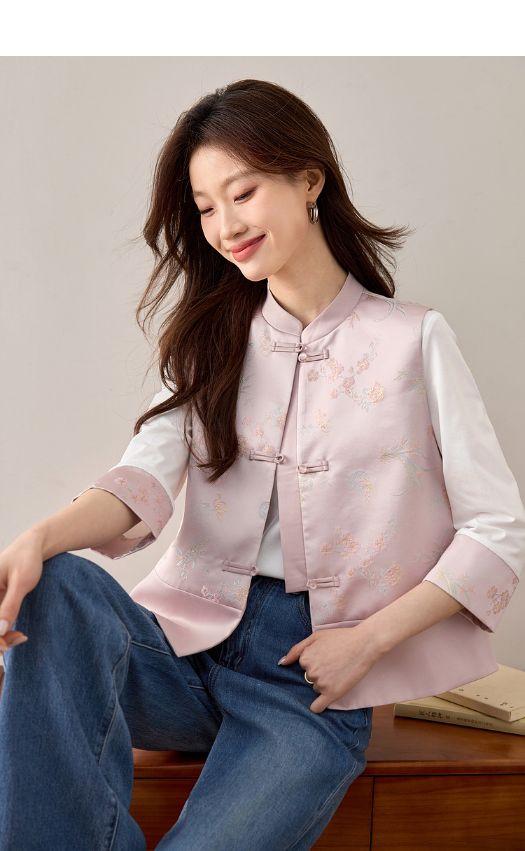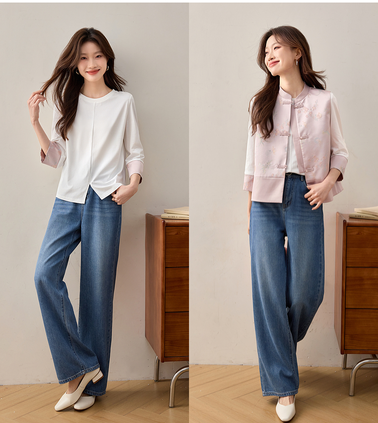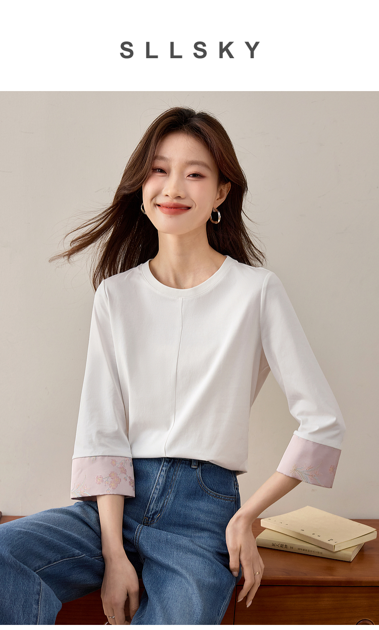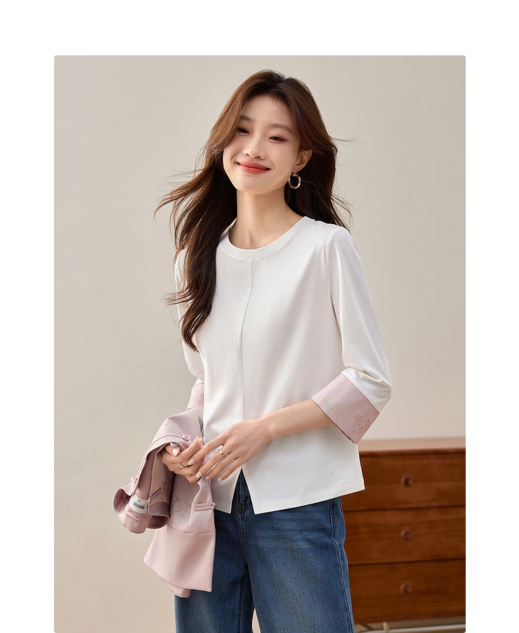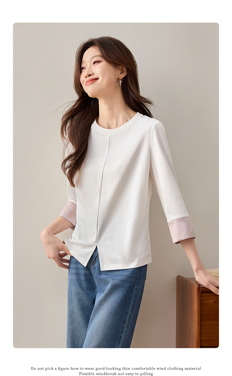 【周四狂欢价】熙世界新中式刺绣圆领T恤女秋季2025新款国风织锦休闲白色打底衫