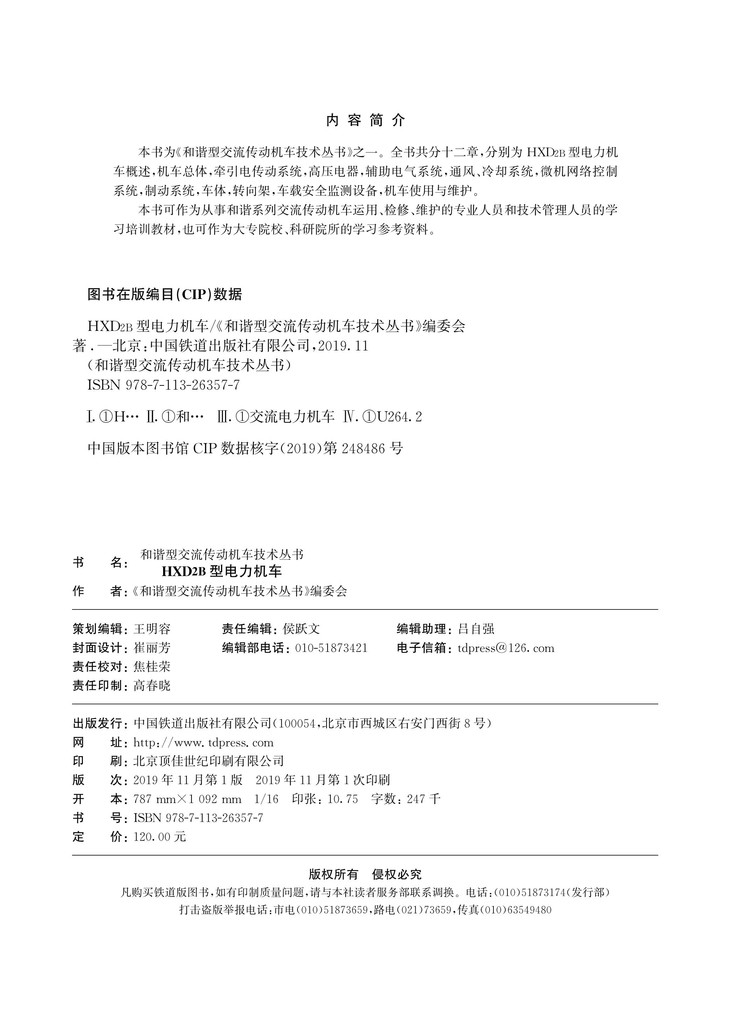 《HXD2B型电力机车》是《和谐型交流传动机车技术丛书》之一,共分十二章,别对机车主要技术性能及参数,机车总体及通风冷却系统、牵引电传动系统、高压电器、辅助电气系统、微机网络控制系统、制动系统、车体及转向架、列车运行控制系统车载设备、机车试用于维护等方面进行了介绍。该书图文并茂、通俗易懂,是一本通用的机车技术科技书籍。