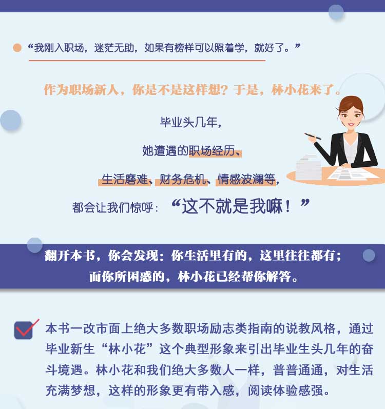 本书着眼于毕业头几年的年轻人在职场、住房、理财、恋爱、自我提升等五大方面的境况,塑造了一个具有代表性的毕业生“林小花”形象,*展现了高校毕业生的工作和生活状态,教会毕业生在走入社会的头几年关键时期应该想什么、做什么,不要怕什么、忘什么,寓教于乐,深入浅出,在阅读林小花的工作和生活境遇时,让自我得以提升进阶。