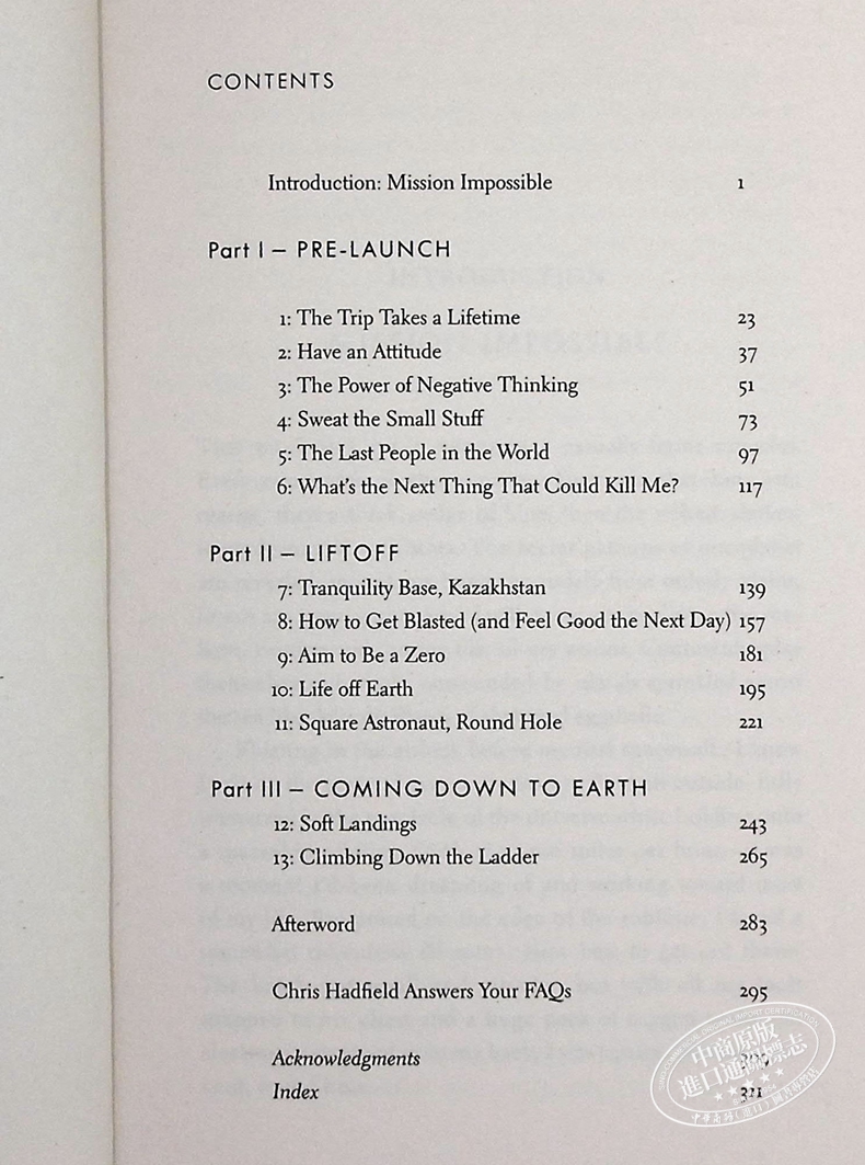 Introduction - i: Introduction: Mission Impossible Unit - Part 1: PRE-LAUNCH Chapter - 1: The Trip Takes a Lifetime Chapter - 2: Have an Attitude Chapter - 3: The Power of Negative Thinking Chapter - 4: Sweat the Small Stuff Chapter - 5: The Last People in the World Chapter - 6: What's the Next Thing That Could Kill Me Unit - Part 2: LIFTOFF Chapter - 7: Tranquility Base, Kazakhstan Chapter - 8: How to Get Blasted (and Feel Good the Next Day) Chapter - 9: Aim to Be a Zero Chapter - 10: Life off Earth Chapter - 11: Square Astronaut, Round Hole Unit - Part 3: COMING DOWN TO EARTH Chapter - 12: Soft Landings Chapter - 13: Climbing Down the Ladder Acknowledgements - ii: Acknowledgments Index - iii: Index Section - iv: Illustrations