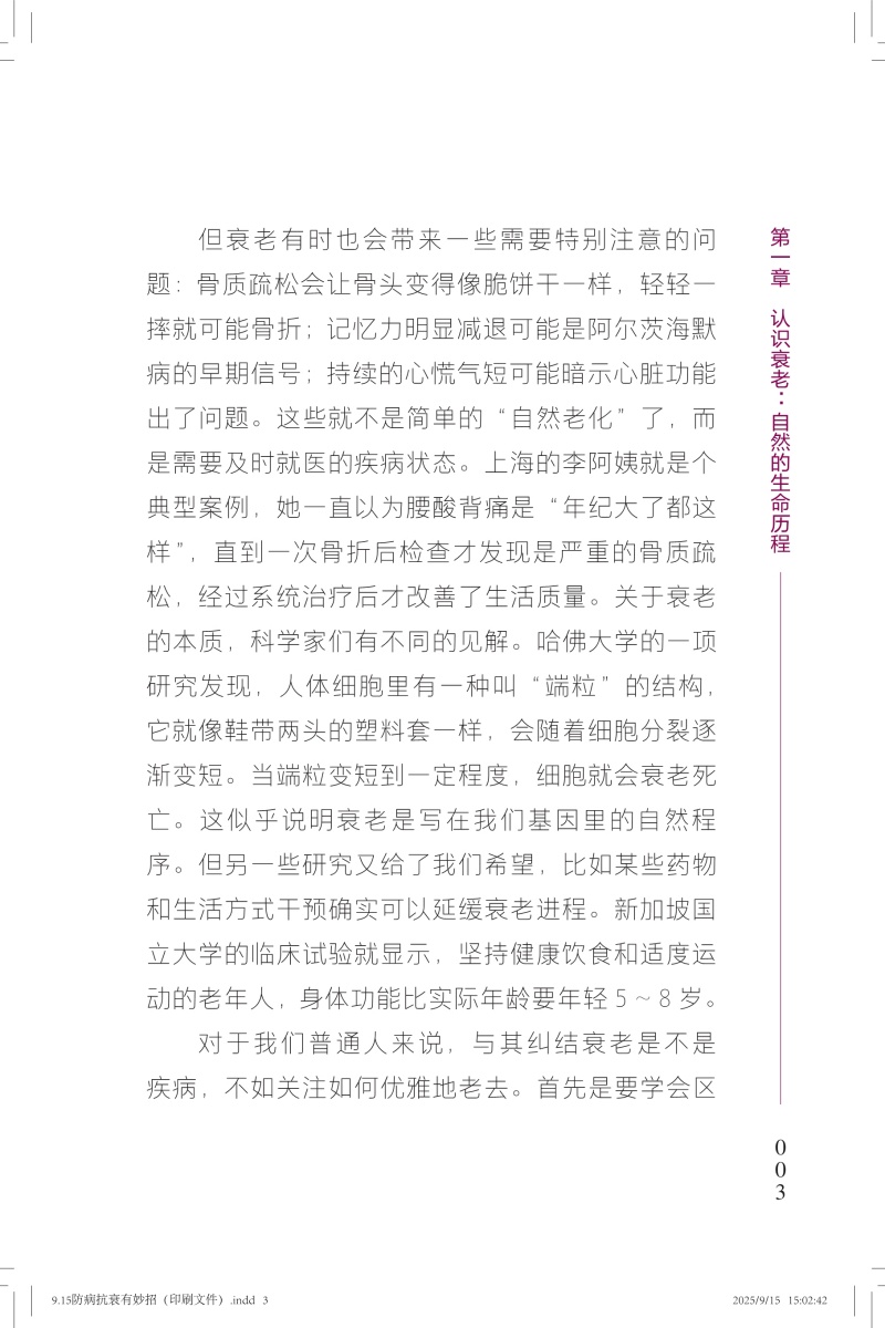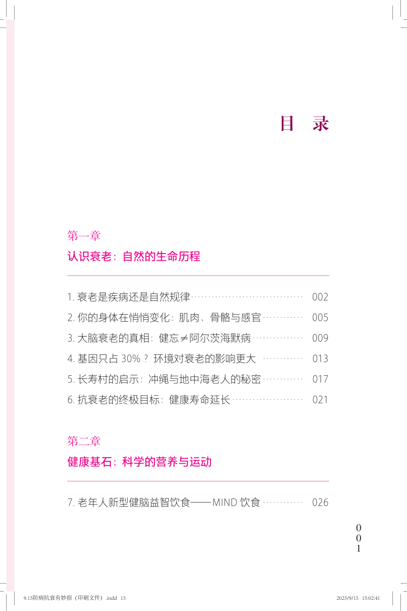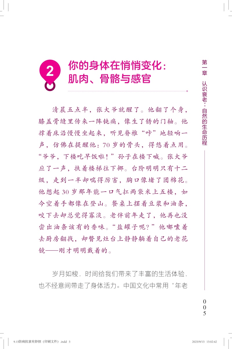 本书是“60 岁开始读”科普丛书之一,旨在科学引导老年人积极应对衰老,实现“老而不衰,老有所健”。 全书从破除迷思入手,阐明衰老是自然规律,揭示环境与生活方式对健康衰老的关键作用。核心聚焦实用行动,提供易于操作的MIND 健脑饮食、防跌倒平衡训练、轻量增肌方案及慢性病管理指南等。强调预防为先,详解年度体检、三高“3-5-7”管理、骨质疏松自测及疫苗接种策略等,辅以记忆训练、手指操等脑保健法。关怀心灵健康,指导退 休调适、情绪管理,并推荐正念冥想、兴趣培养与智能社交。同时关注安全生活,介绍居家适老化改造细节、防跌倒“三区管理法”及智能穿戴、AI 健康管家等科技助老应用。