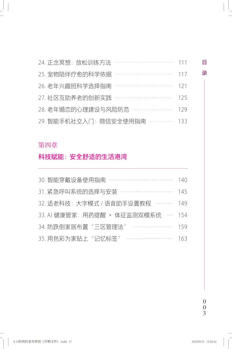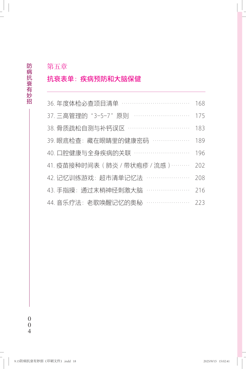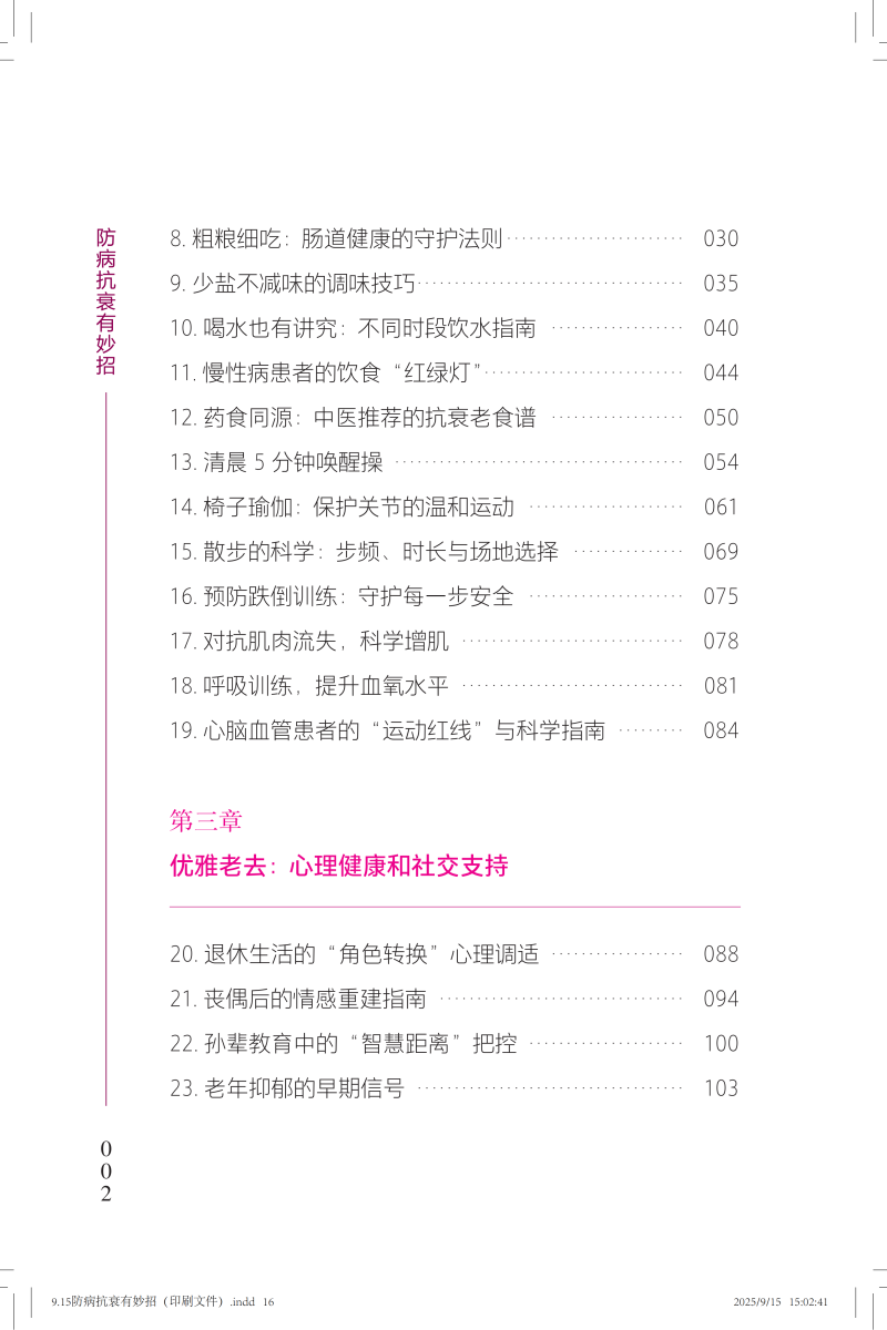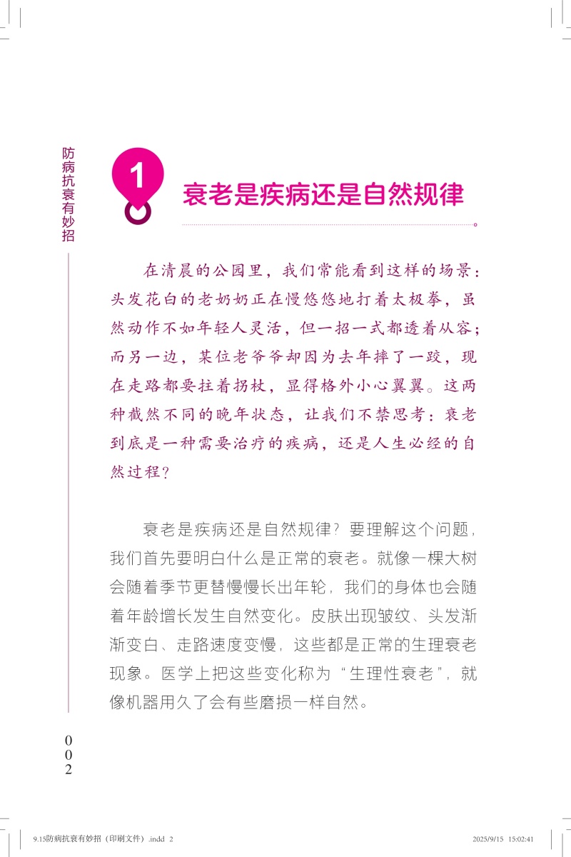 本书是“60 岁开始读”科普丛书之一,旨在科学引导老年人积极应对衰老,实现“老而不衰,老有所健”。 全书从破除迷思入手,阐明衰老是自然规律,揭示环境与生活方式对健康衰老的关键作用。核心聚焦实用行动,提供易于操作的MIND 健脑饮食、防跌倒平衡训练、轻量增肌方案及慢性病管理指南等。强调预防为先,详解年度体检、三高“3-5-7”管理、骨质疏松自测及疫苗接种策略等,辅以记忆训练、手指操等脑保健法。关怀心灵健康,指导退 休调适、情绪管理,并推荐正念冥想、兴趣培养与智能社交。同时关注安全生活,介绍居家适老化改造细节、防跌倒“三区管理法”及智能穿戴、AI 健康管家等科技助老应用。