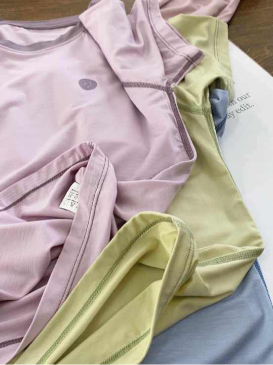 笑脸款上衣细节!撞色插肩袖/领口设计,更加吸睛, 活动空间更加充足,不拘束!后领同色面料包边条, 舒适度拉满~ 袖口下摆,走线清晰细密,不易开线~