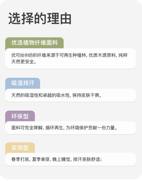 优可丝®是一种纯天然的面料! 100%优质木源原料中提取优质纤维素纤维,安全性和舒适性更高,而且特别环保可完全降解♻️循环再生 🔅具有不易褪色、不起球等优点。 柔软肤感/自由呼吸/不怕静电 一款让你无限回购的家居服套装! 优可丝 超柔柔柔柔柔~ 四个冰淇淋🍦色系拼袖 太奶呼呼了 奶油般触感 丝滑 所有宝贝都必须拥有!
