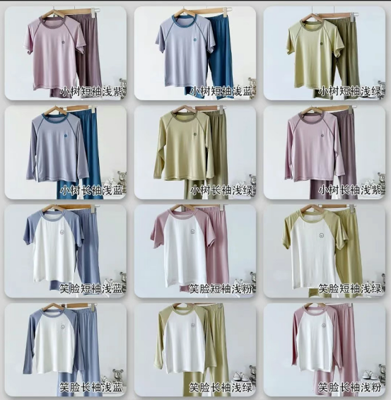 一共四款 有长袖长裤 短袖短裤 颜色也是各种各样 一年四季 有这个套装就够啦 ① 笑脸短袖套装 ② 笑脸长袖套装 ③ 小树短袖套装 ④ 小数长袖套装