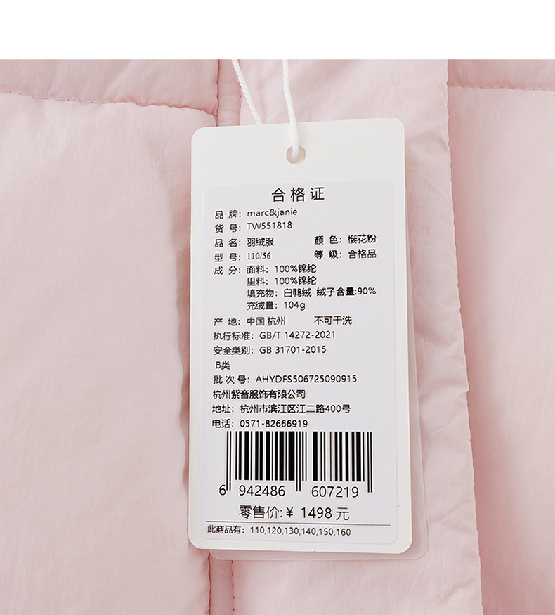 【无氟防泼水】马克珍妮女童轻盈加厚连帽羽绒服2025年冬装新款551818