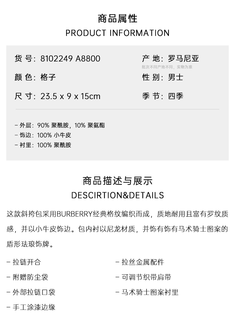 BURBERRY 巴宝莉 男士盾牌铭牌徽标网格斜挎包 格子 8102249 A8800