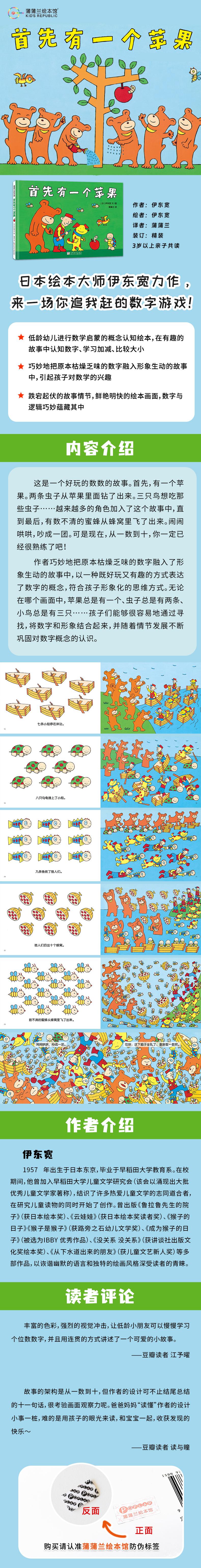 这是一个好玩的数数的故事。首先,有一个苹果。两条虫子从苹果里面钻了出来。三只鸟想吃那些虫子……越来越多的角色加入了这个故事中,直到最后,有数不清的蜜蜂从蜂窝里飞了出来。闹闹哄哄,吵成一团。可是现在,从一数到十,你一定已经很熟练了吧!作者巧妙地把原本枯燥乏味的数字融入了形象生动的故事中,以一种既好玩又有趣的方式表达了数字的概念,符合孩子形象化的思维方式。无论在哪个画面中,苹果总是有一个、虫子总是有两条、小鸟总是有三只……孩子们能够很容易地通过寻找,将数字和形象结合起来,并随着情节发展不断巩固对数字概念的认识。