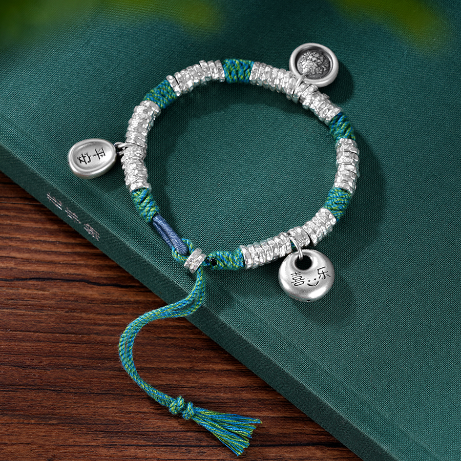 【寓意】:实心锤纹手工银圈搭配彩绳,点缀平安喜乐坠饰,使手串色调古朴温润,一款寓意平安顺遂、好运绵绵的作品,送礼自用两相宜。