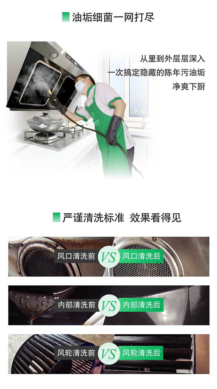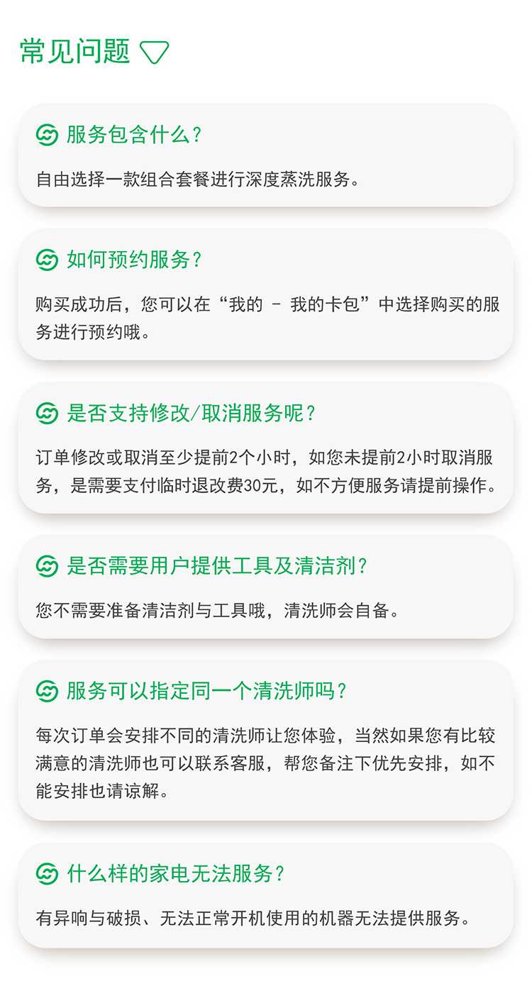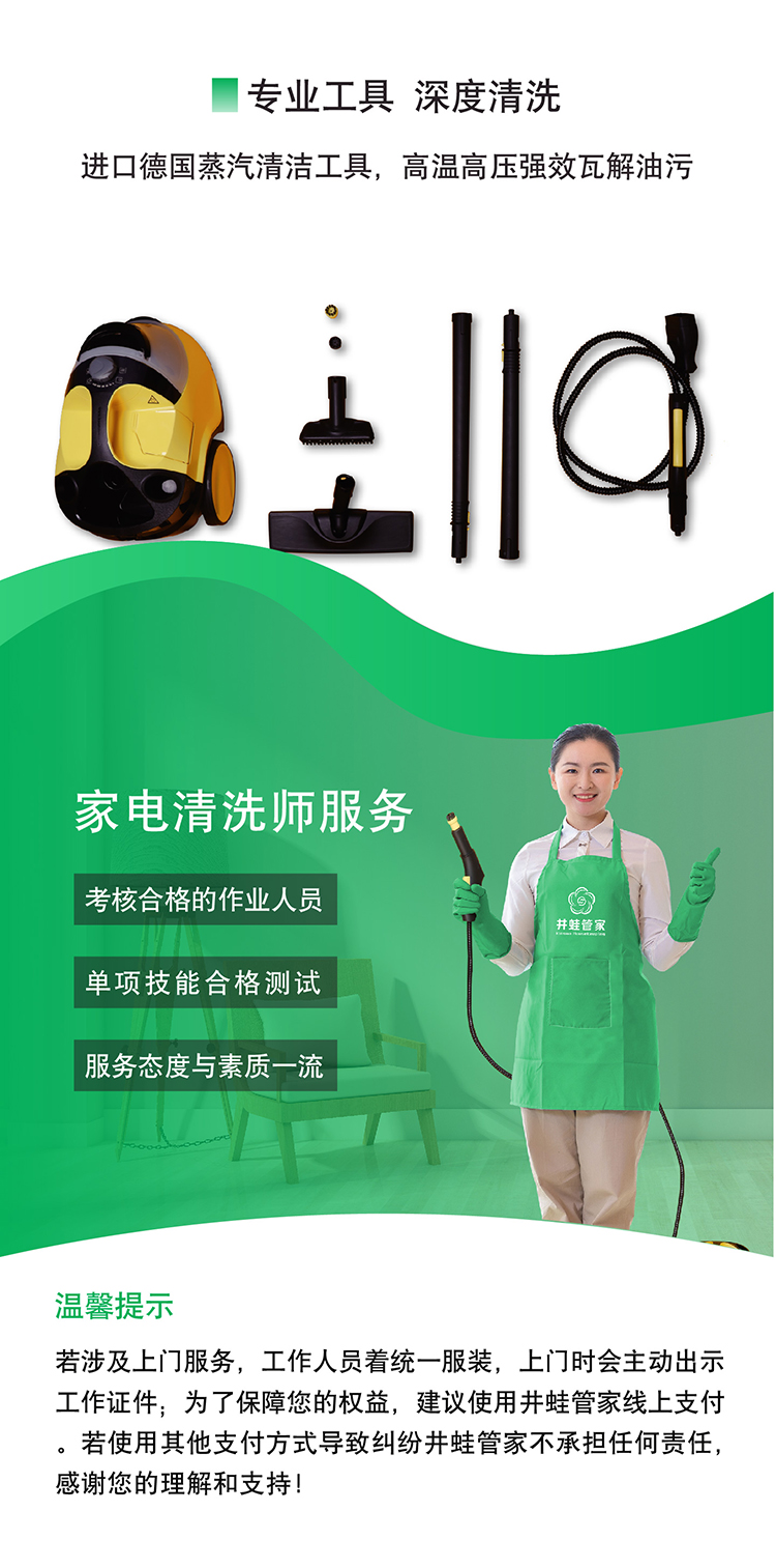 5.产品内容:油烟机、冰箱、洗衣机、空调、燃气热水器任意选择3件清洗。