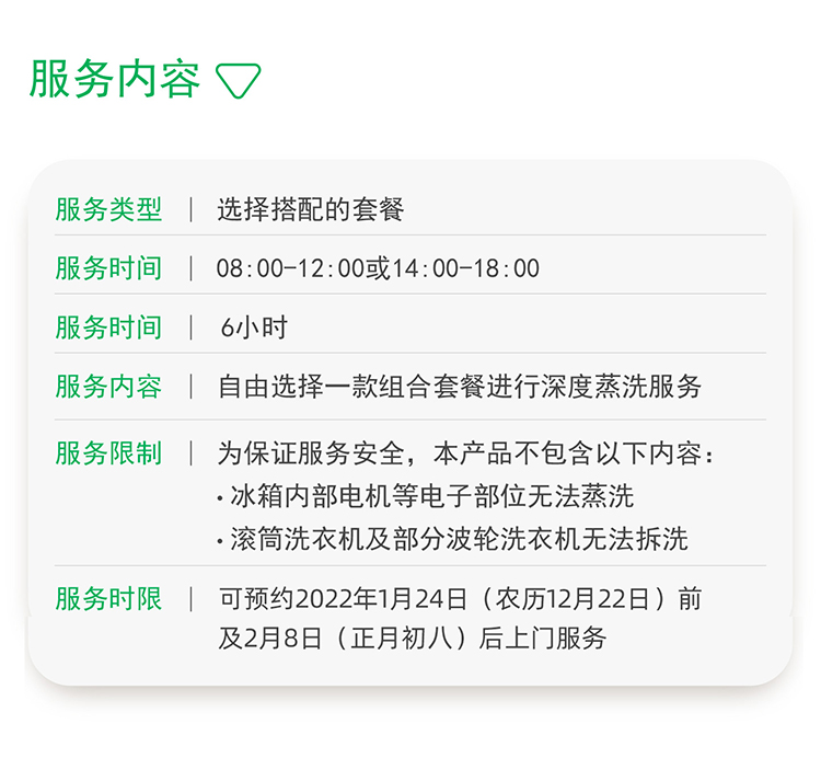 4.春节包括产品活动购买有效期2021年12月31日前,可预约2022年1月24日前清洗。