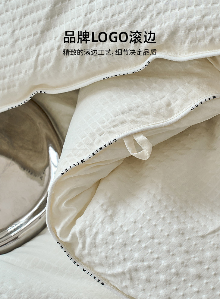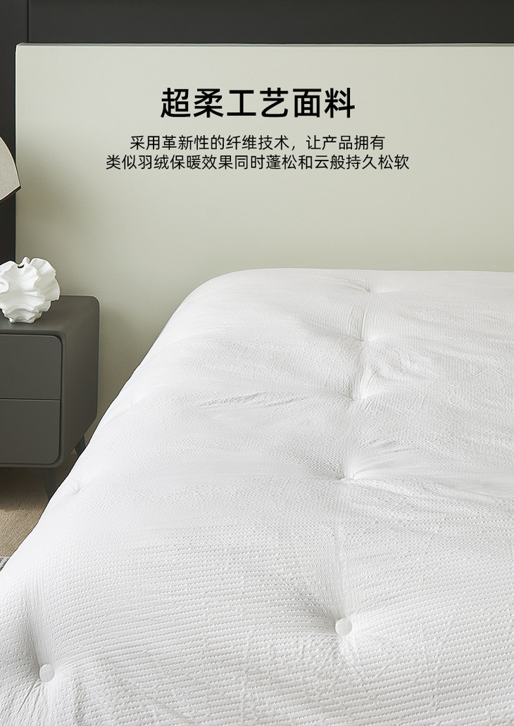 这款被子的云柔棉,从工艺研发到性能呈现,每一处都透着高端家居的匠心 —— 其核心优势, 正源于那套特殊创新的陶瓷温感微绒工艺,让面料质感与柔软度实现双重跃升。 这套工艺隶属于超柔工艺的高阶范畴,并非简单的纤维处理 它能将云柔棉的绒羽打磨得格外匀密细腻,每一根绒丝的长度都保持精准统一,宛若精心梳理过的柔绒,既完整留存了云柔棉本身自带的温润高级质感, 又通过工艺加持,把 “超柔” 特性推向新维度 —— 指尖抚过时,触感比普通云柔棉更显绵密软糯,像是裹住一团蓬松的暖云,柔得有层次、软得有质感。 更贴心的是,面料还做了轻微磨毛处理 绒面带着恰到好处的细腻摩擦力,与四件套贴合时能牢牢 “锁住” 位置,不管夜里怎么翻身,被子都不会在套件里跑偏移位, 让每一次躺卧都能享受到 “被妥帖包裹” 的舒适,把工艺的精致,藏进日常使用的细节里。