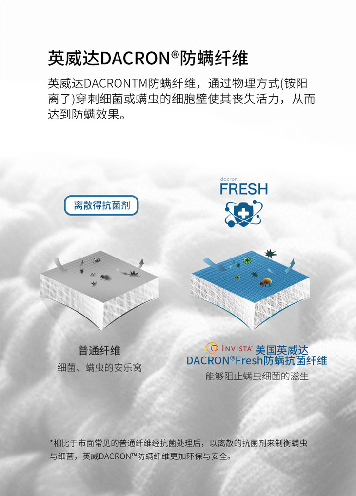 DACRON® 抗菌防螨:以硬核防护力,筑牢睡眠健康结界 在抗菌防螨领域,DACRON®纤维的表现堪称行业标杆级水准——它并非简单的“表面防护”,而是从根源构建起一道强韧的健康防线,让常见有害菌群与螨虫无处遁形。 针对金黄色葡萄球菌、大肠杆菌、白色念珠菌等日常易滋生的致病隐患,其抑菌率直逼90%以上,能快速压制菌群繁殖,减少肌肤接触感染的风险; 防螨与驱螨效果更堪称“天花板”:防螨率实现100%全阻隔,让螨虫无法在纤维间存活,驱螨率达99% ,从源头切断螨虫入侵路径,同时还能持续阻隔螨虫排泄物等过敏原,敏感肌、鼻炎人群也能彻底告别“床品过敏”的困扰。 更令人惊艳的是其长效防护力:即便经历20次水洗揉搓,纤维内部的抗菌防螨结构依旧稳固,防护效果不打折扣、不衰减——这在行业内实属少见, 彻底打破“抗菌防螨效果随洗涤流失”的痛点,让每一次躺卧,都能享受到“从首用到久用”的稳定健康守护。