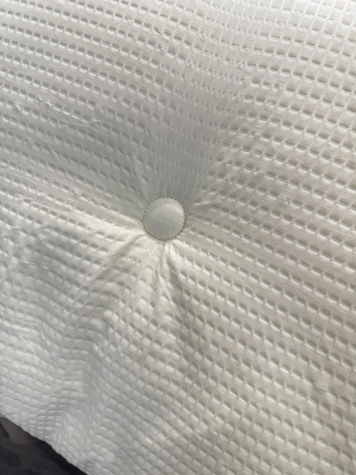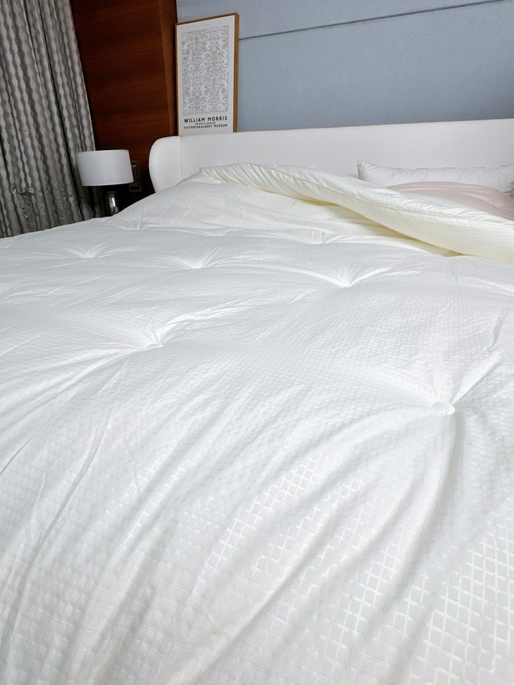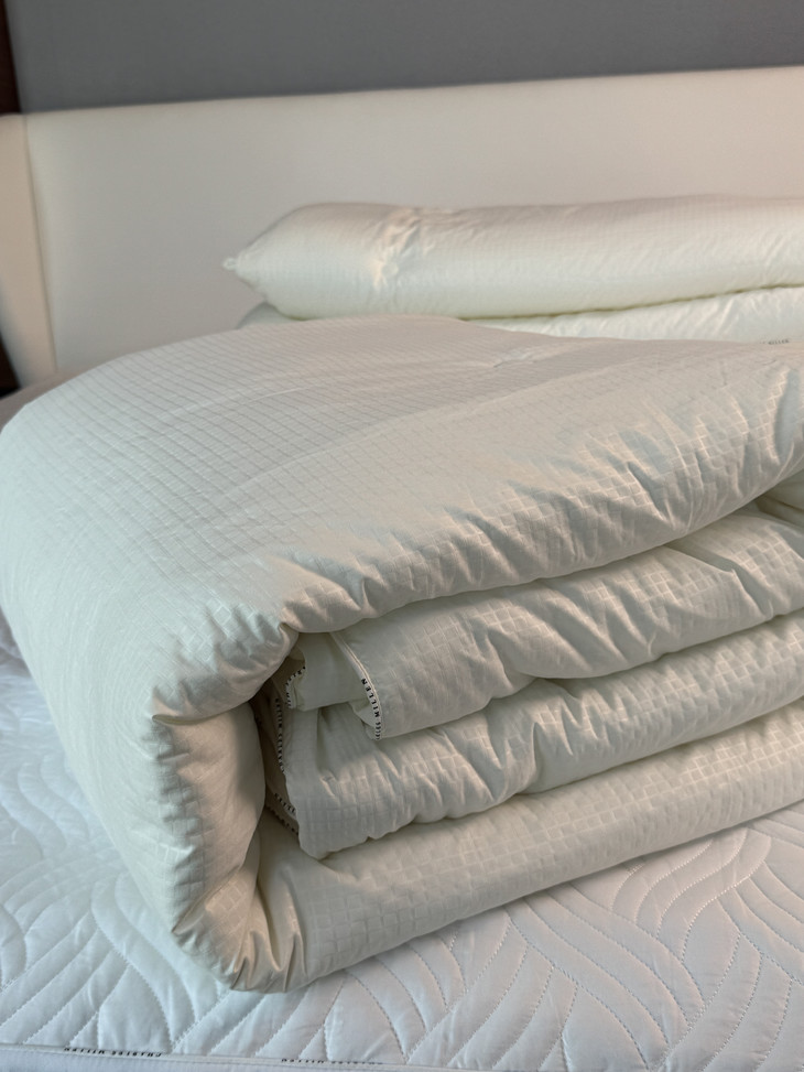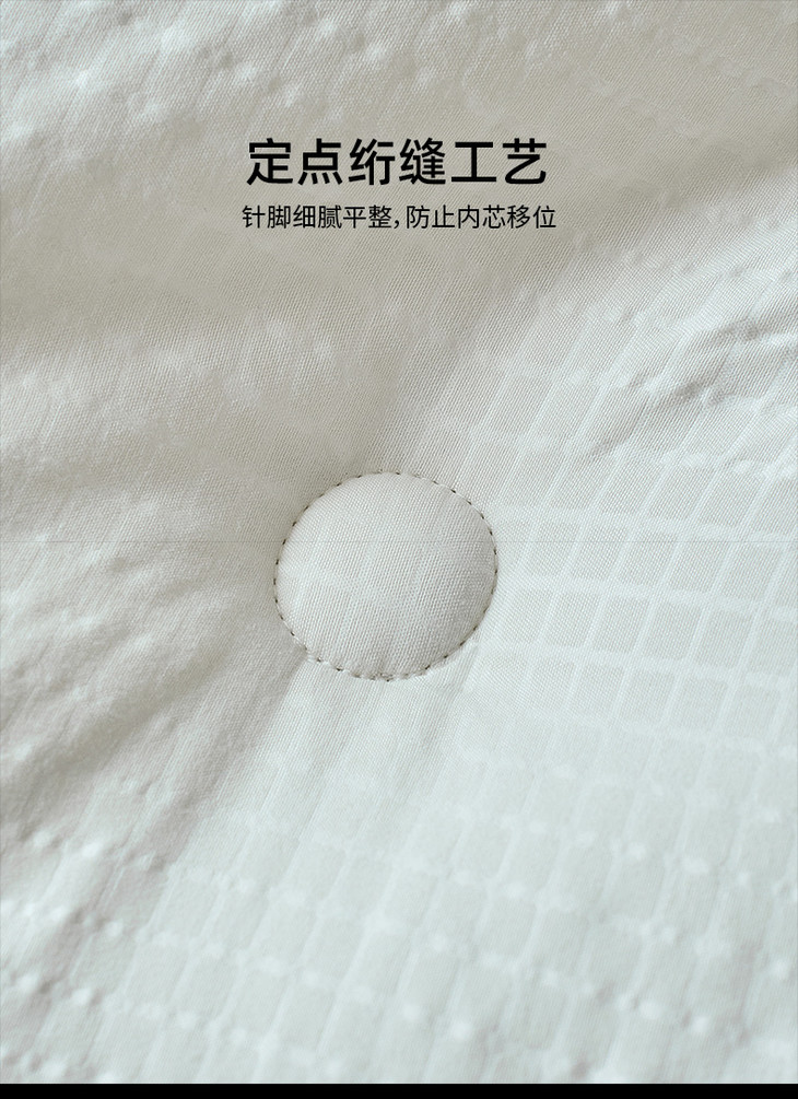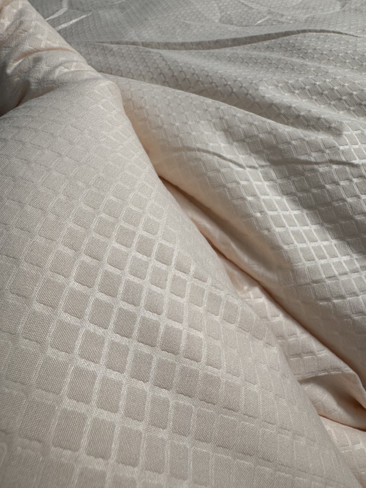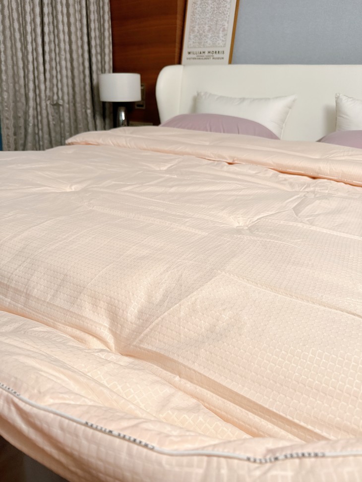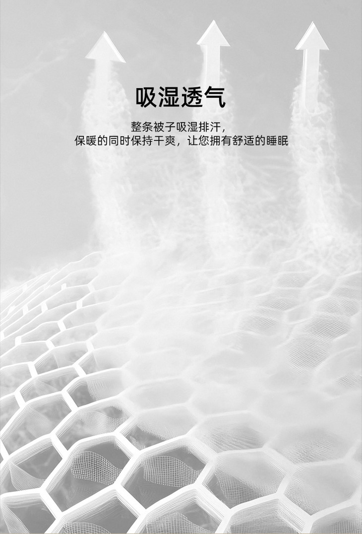 云柔棉的 “呼吸魔法”:双重多孔结构,暖而不闷的贴心奢造 这份贴心,藏在云柔棉面料的 “呼吸肌理” 里 —— 它不止靠上万根棉纤维自带的中空结构形成 “天然储暖仓”, 更在面料表面精心雕琢出方形透气孔,二者交织成 “双重多孔透气系统”,像给被子装了套 “智能空气循环装置”,让透气与保暖达成完美平衡。 这组结构能构建出畅通无阻的自然空气通道 吸湿排汗时,它是 “快干通道”—— 睡眠中排出的潮气会顺着纤维中空与方形透气孔快速出逃, 不堆积在面料与肌肤之间,彻底告别闷汗黏腻的黏身感,连梅雨季睡都能保持肌肤干爽; 锁温保暖时,它是 “恒温屏障”—— 中空纤维能牢牢锁住身体散发出的热量, 方形透气孔则只排潮气不泄暖,让暖意始终包裹身体却不憋闷,寒冬暖得温润,春秋盖着不燥热。 不用再在 “透气” 和 “保暖” 间做选择,这组双重结构把 “暖而不闷,润而不燥” 的睡眠体验,织进了每一寸面料里。
