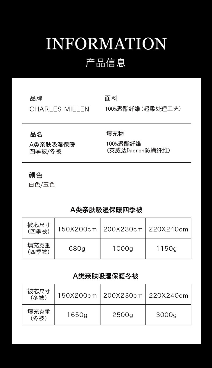 Charles Millen A类亲肤吸湿保暖四季被/冬被 高岛屋专柜在售款!! 进驻山姆的品牌,高岛屋专柜在售2380 今日开团秒杀99元起! 添加美国英威达 DACRON®NATURAL+系列防螨抗菌纤维,实现 100% 物理防螨,降低过敏风险 采用革新性的超柔工艺,贴肤触碰时是细腻顺滑的触感
