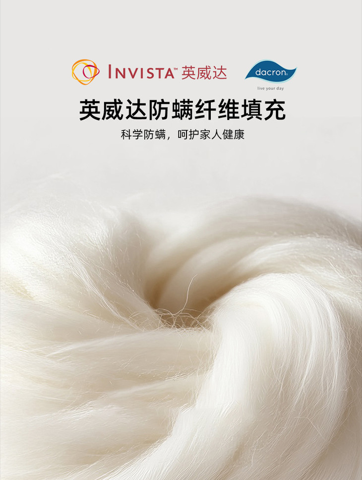这款被芯的填充核心,选用美国英威达 Dacron™专业防螨纤维 —— 它绝非普通纤维可比,从防螨原理到使用体验都透着 “行业标杆” 的底气,直接为睡眠健康筑起一道强韧防护盾,让每一次躺卧都满是安心。 而英威达的 来头,更印证了这份防护的含金量, 它的前身是杜邦纺织品及室内装饰公司,承袭了杜邦在纤维领域的深厚技术积淀; 2003 年从杜邦纺织纤维部门独立,以 “INVISTA” 之名开启新征程;2004 年被科赫工业集团收购后,与 KoSa 强强合并,正式确立 “英威达” 品牌身份,一步步成长为全球公认的尼龙巨头。 如今的英威达,总部扎根美国堪萨斯州,全球布局更显深厚 —— 仅在中国,便在上海青浦建立生产基地辐射整个亚太区域,累计投资超 145 亿元,构建起从研发到生产的完整产业链; 其中纤维业务更是其巩固中国市场的核心,凭借严苛品控与前沿技术,成为无数高端家居品牌的 “优选合作伙伴”。 用这样有 “巨头背书” 的专业防螨纤维填充,不止是防螨效果的保障,更是对睡眠健康的高阶守护,让 “睡个安心好觉” 有了实打实的品牌硬实力支撑。