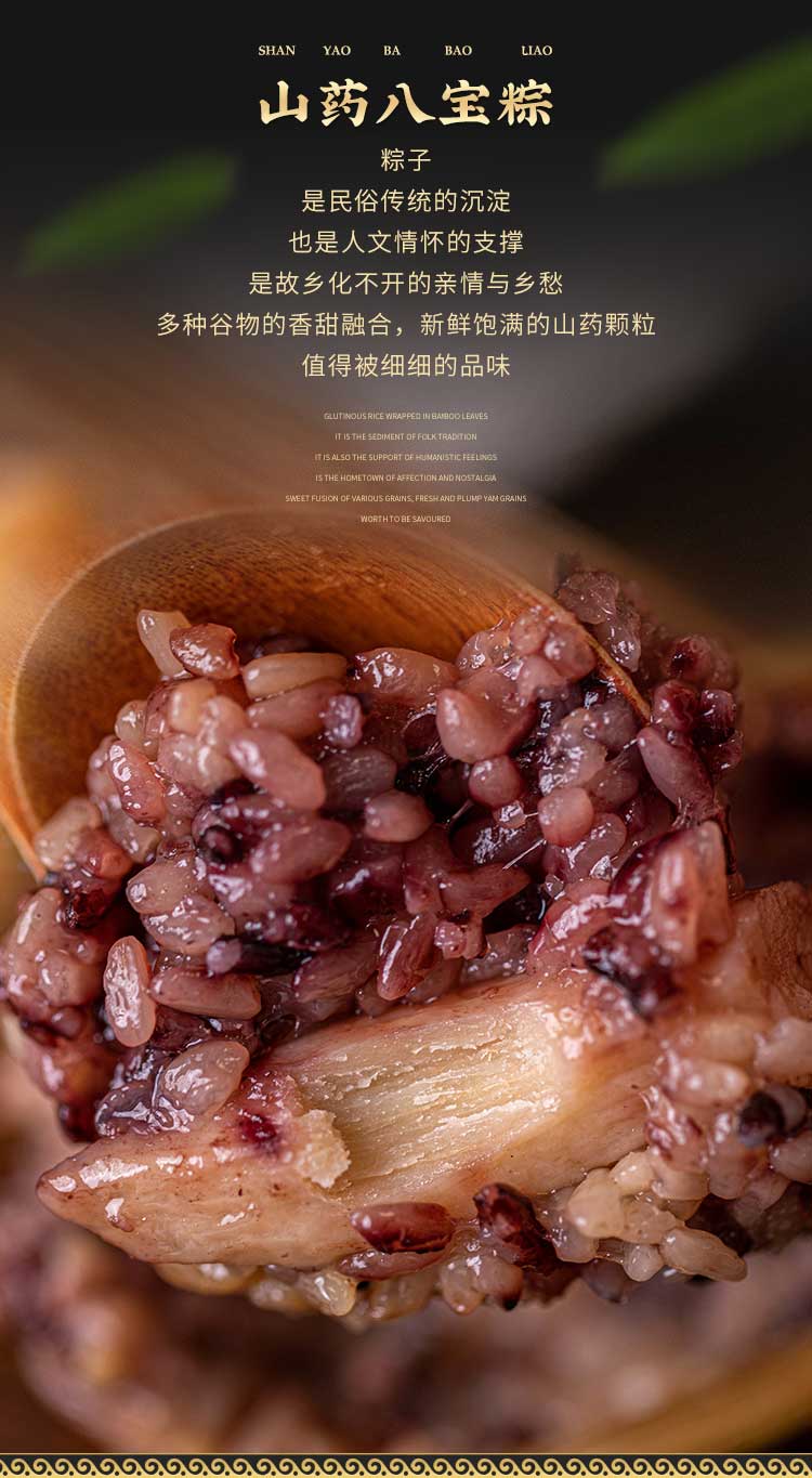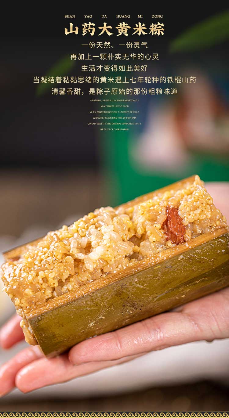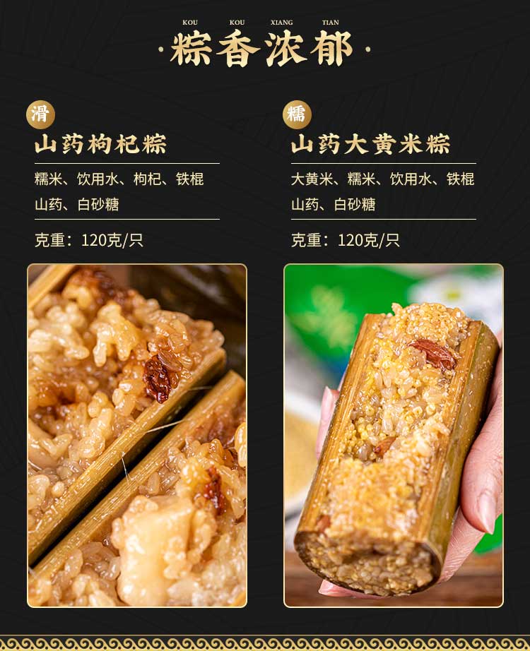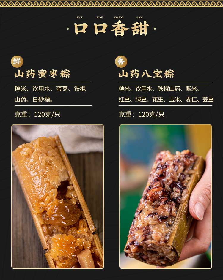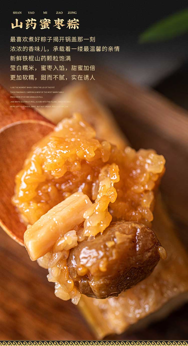 寻味竹粽甜香软糯,铁棍山药馅料美味,锁住清香与营养,剥开即食,香甜软糯,口味独特,不同口味,满足不同需求。