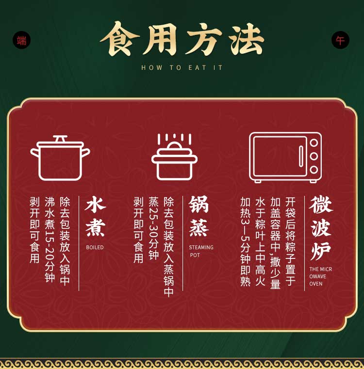 开袋后将粽子置于加盖容器中,撒少量水于粽叶上,中高火加热3—5分钟即熟。