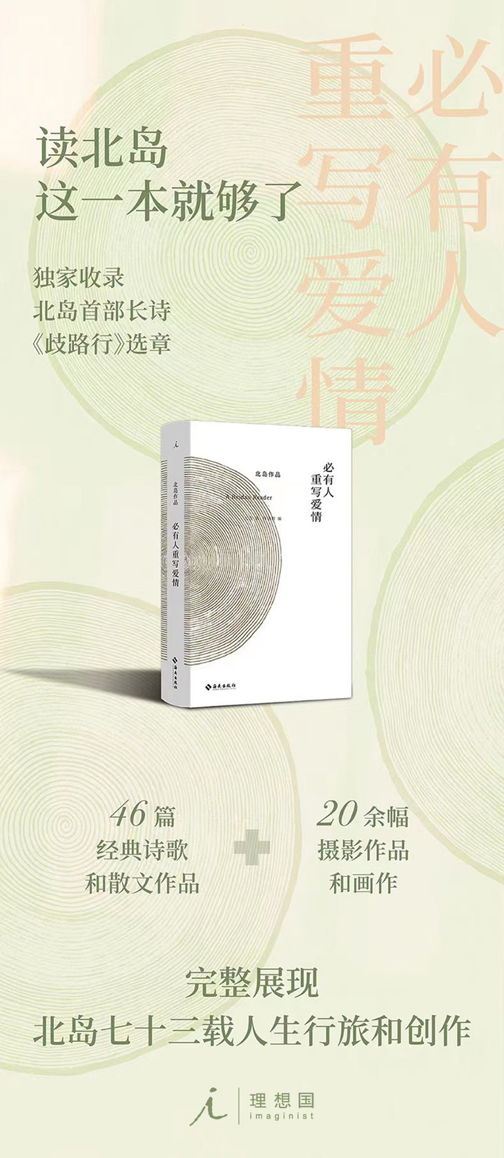 《必有人重写爱情》是著名诗人北岛的作品精选集,46篇经典诗歌与散文作品,呈现诗人、散文家、画者、摄影者北岛的创作全貌。“一诗一文”的编排特色,如同中国诗话传统之传续。从“暴风雨的记忆”到“词的流亡”到“大地之书”,三辑诗文作品完整展现诗人自童年至今的人生行旅,映照二十世纪下半叶激荡的时代风景。