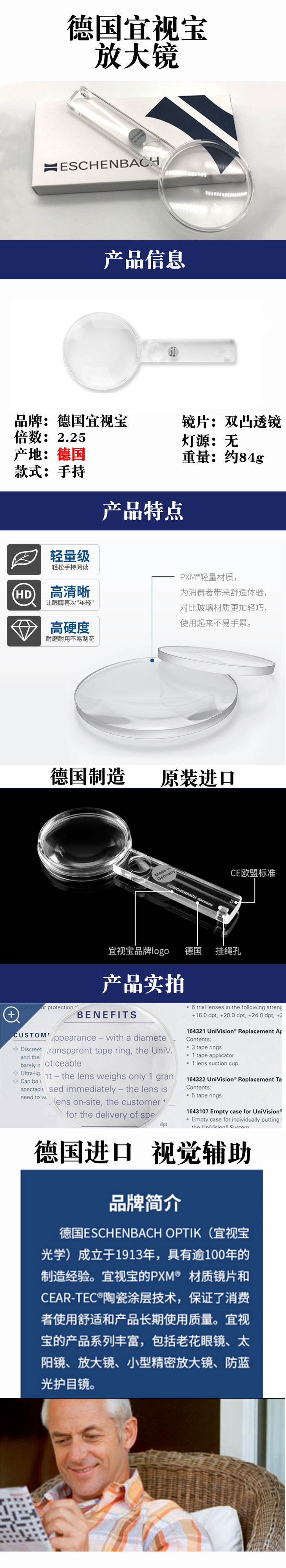 ESCHENBACH宜视宝老人儿童手持2.25倍阅读高清放大镜