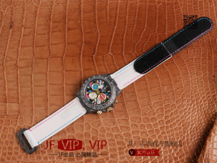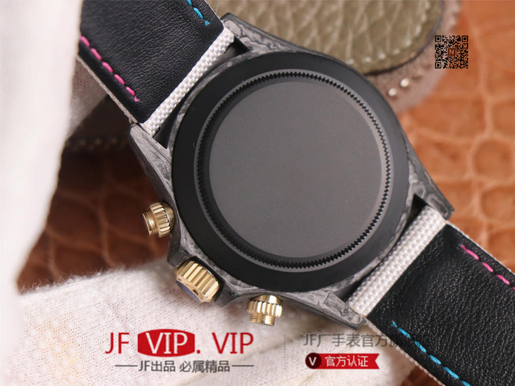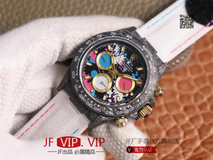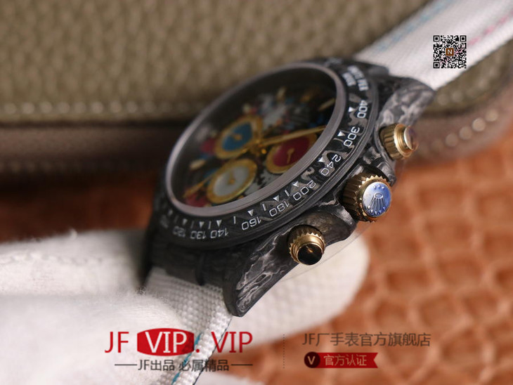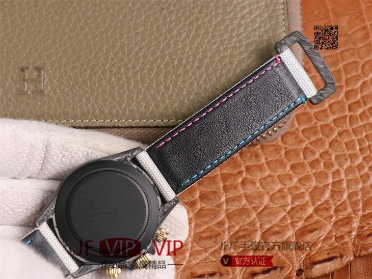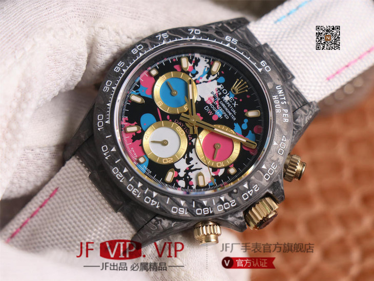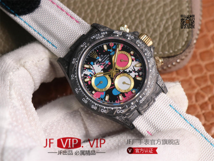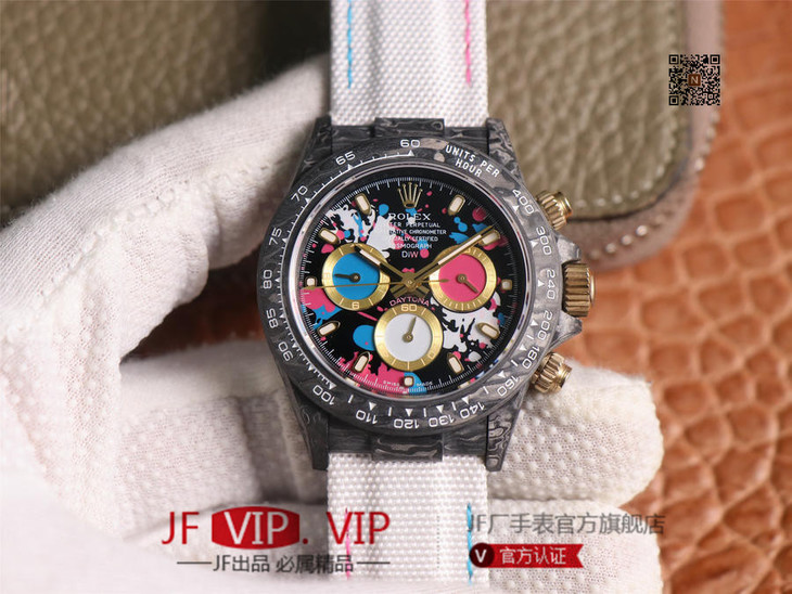 WWF新品发布:ROLEX宇宙计时迪通拿系列之Diw团队改造版。 【表壳】采用碳纤维材质打造,轻盈佩戴舒适,每一只腕表都拥有独一无二的碳纤花纹。 由于碳纤维材质的非常坚硬,表壳在CNC成型过程中损耗也是非常大的! 【镜面】采用双面电镀高透膜工艺,使整个蓝宝石镜面通透性增加50%;一片好的镜面可以很好的提升整个手表质感! 【字面】款式新颖,每一个条钉刻度都有倒角打磨处理,增强字面的质感和光泽度! 【表带】采用降落伞布料手工编织而成,内里牛皮,透气舒适,质地柔软非常贴手,且表带车线和字面颜色相呼应,完全吻合原装! 【机芯】采用精准而成熟的上海7750计时机芯,功能同步原装!