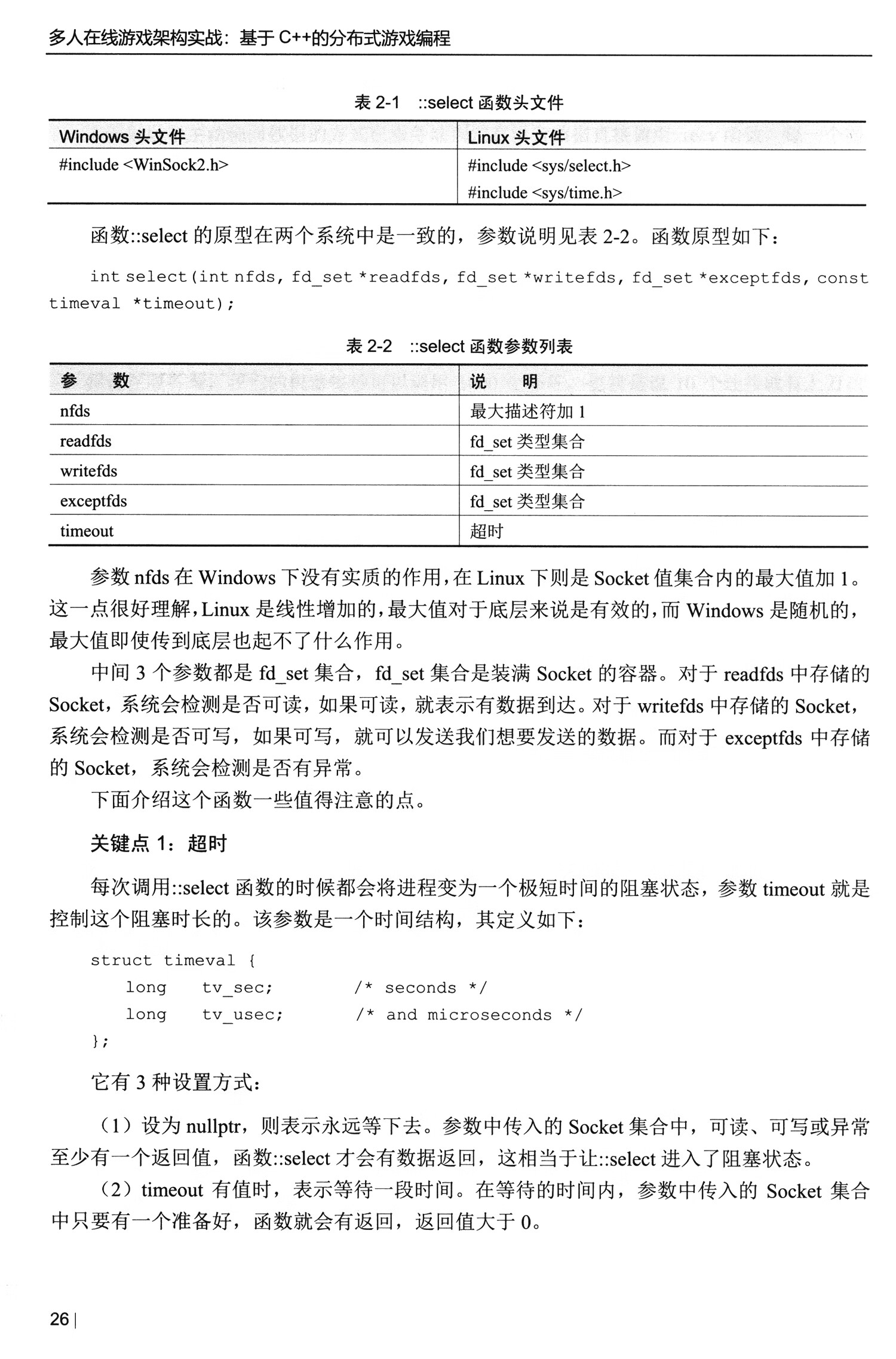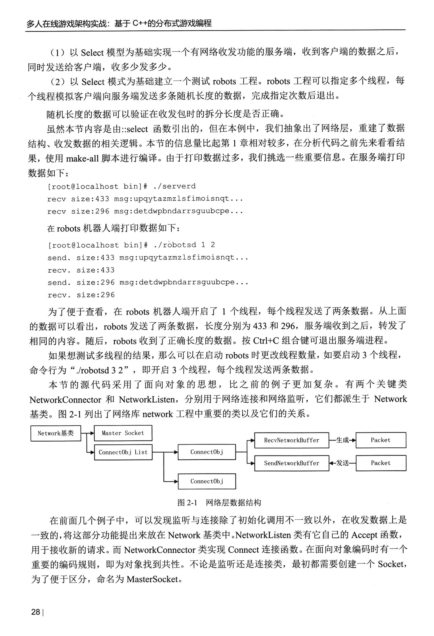 第1、2章主要介绍网络编程。网络编程是网络游戏的核心,毫不夸张地说,网络游戏是一种建立在协议之上的软件。由于系统底层不同,因此示例中会同时介绍基于Windows系统与基于Linux系统的不同网络编程模型。第2章会引入Google公司开发的第三方protobuf库来定义网络协议的内容,该库是目前常用的协议工具。