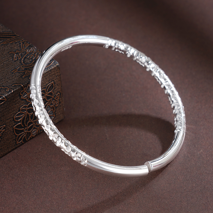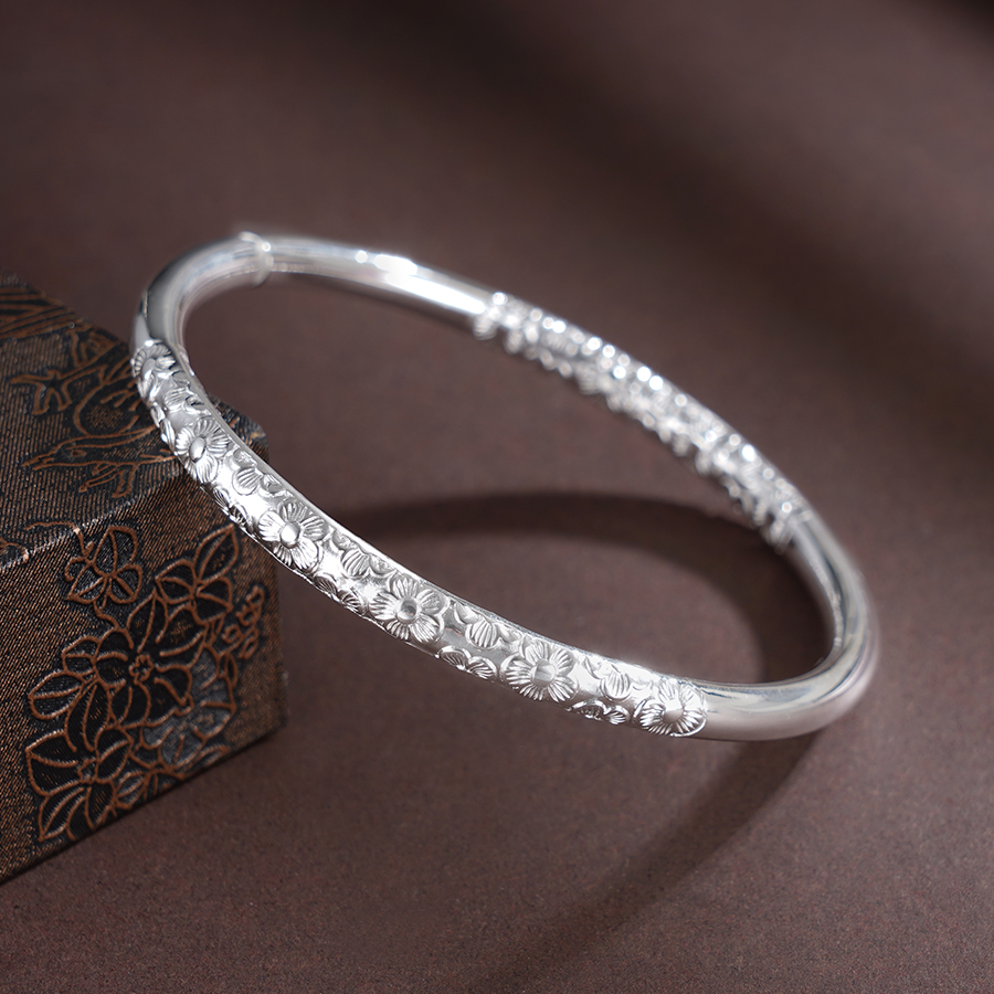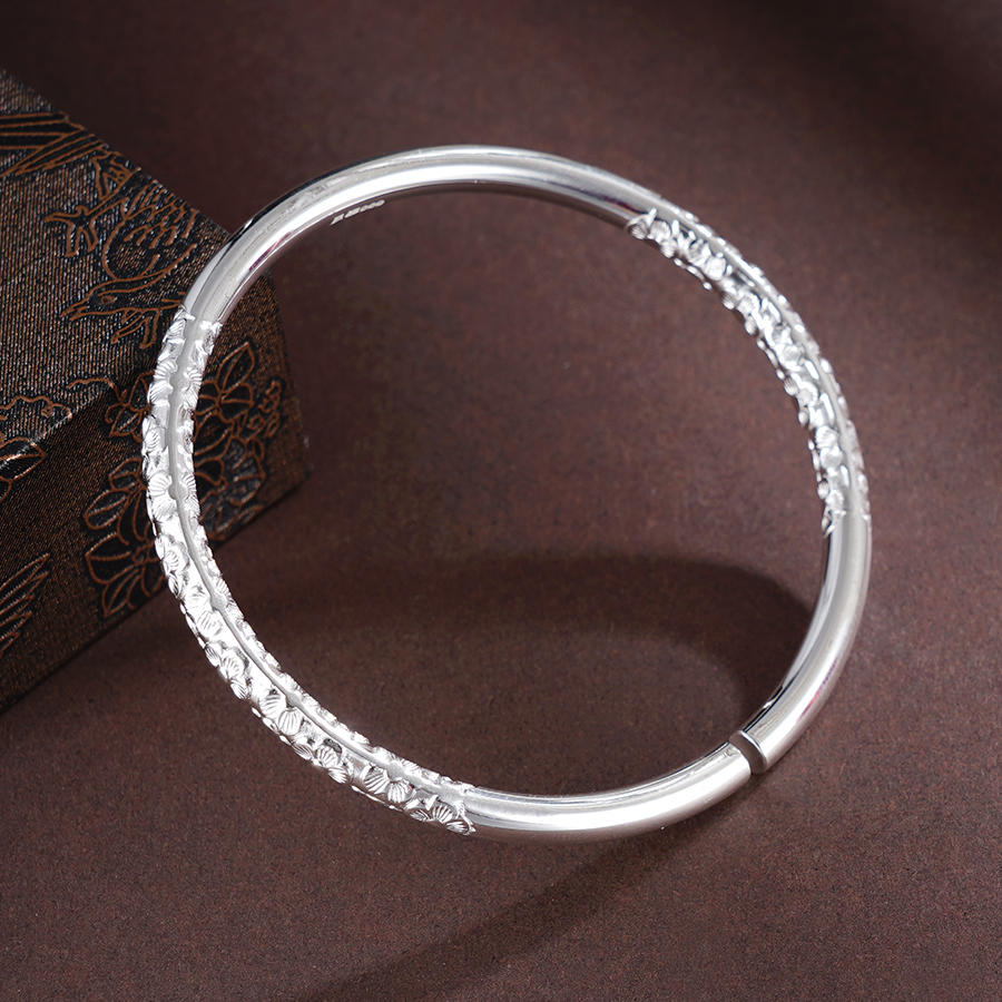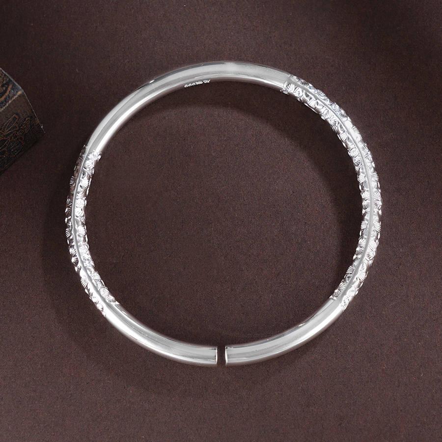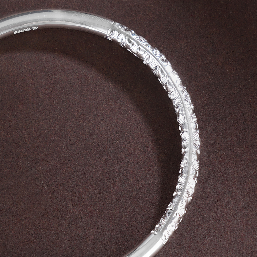 【寓意】:圆棍手镯表面錾刻桃花花纹,花团锦簇,尽显妍丽之姿。桃花朵朵盛开,蕴含“美丽绵延不绝,魅力生生不息”的美好寓意。