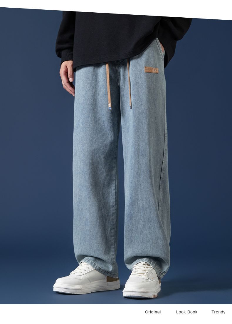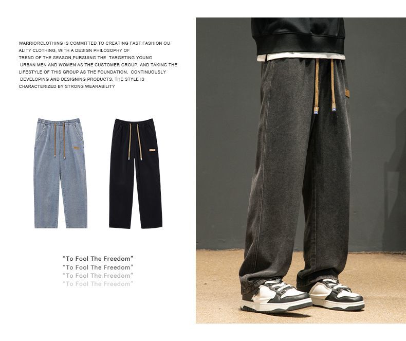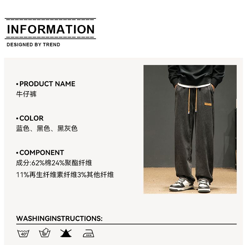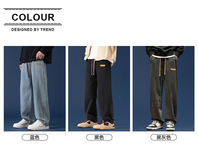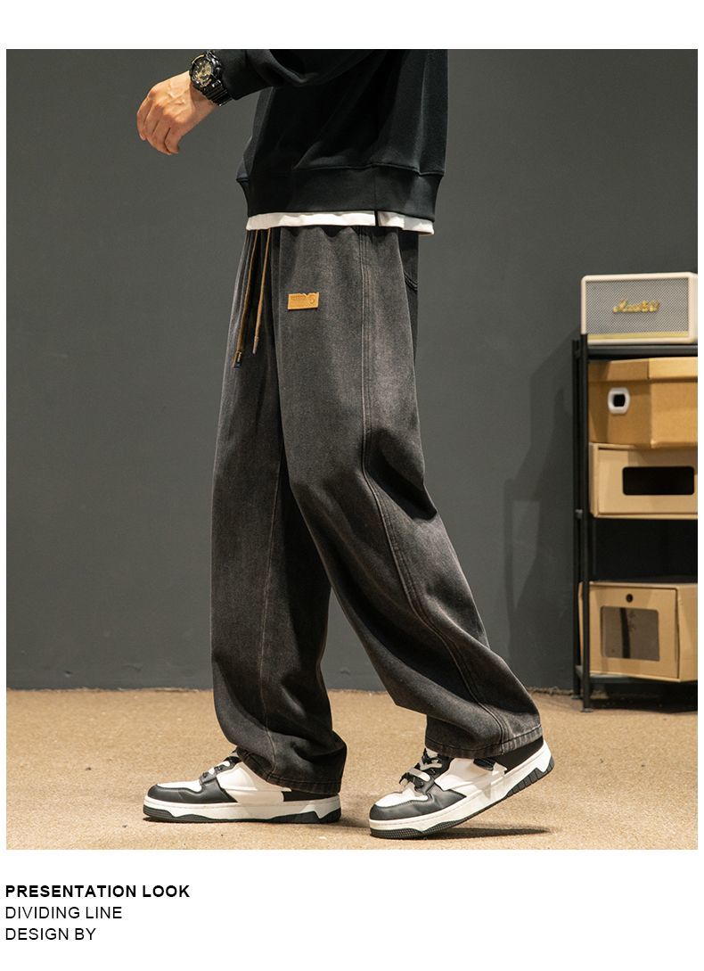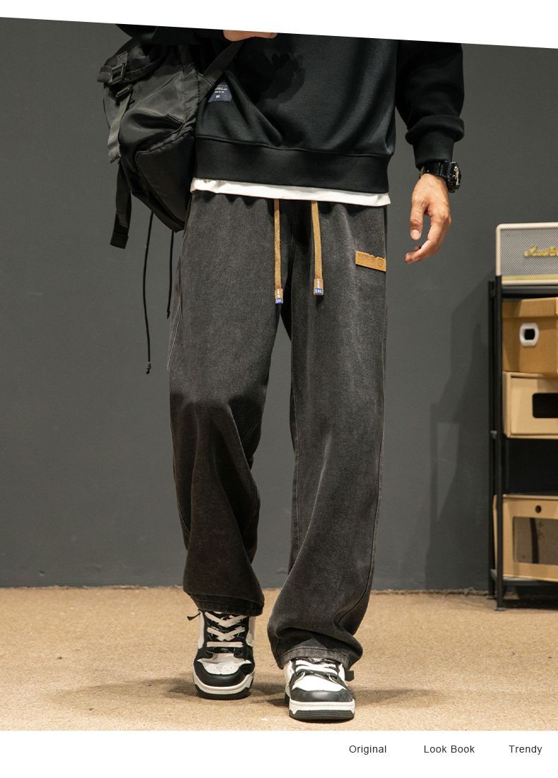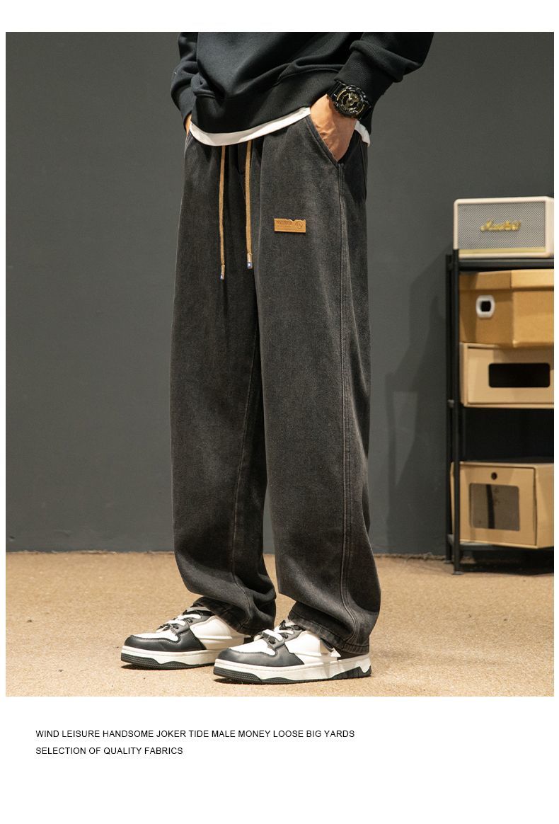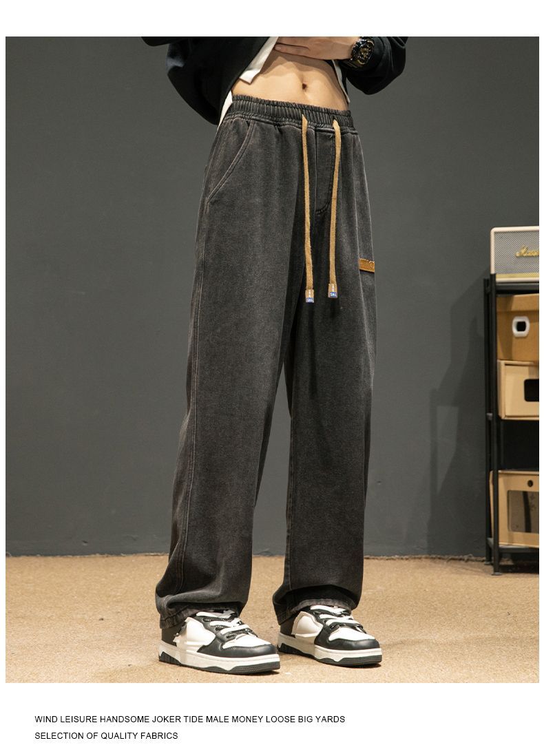 回力牛仔裤男秋冬款2024新款加绒美式高街休闲长裤宽松直筒裤子男