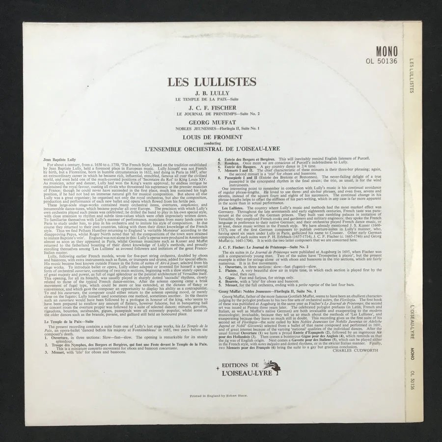 LP黑胶唱片 吕利《和平的寺院》组曲 约翰·菲舍尔《春天日记》 乔治·莫法特《贵族青年》厂牌:Éditions De L'Oiseau-Lyre