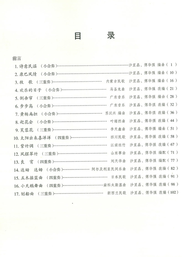 本书共收录17首古筝重奏、合奏曲,均有我国传统名曲和外国民间乐曲改编而成,深受听众喜爱。本书将随附二维码扫码听乐,既满足学习者学习与赏析,又有益于研究者进行版本分析。