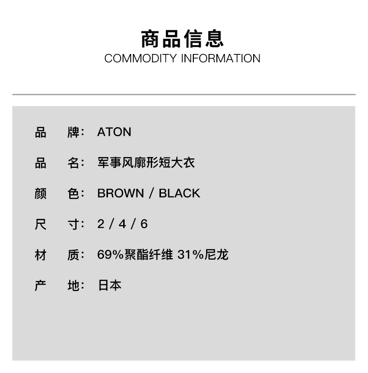 ATON AIR WEATHER 男女中性机能性面料羊毛内胆军事风廓形短大衣