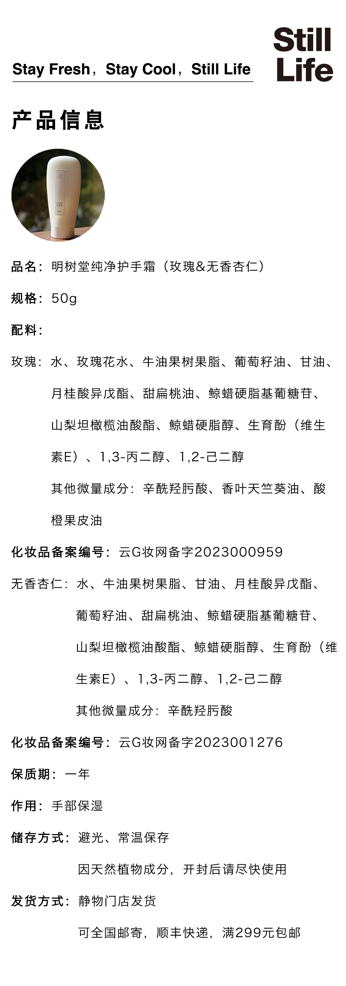 纯净护手霜50ml玫瑰/无香杏仁|明树堂