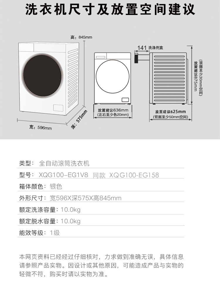 松下 10公斤 洗烘一体 滚筒洗衣机 XQG100-EG155